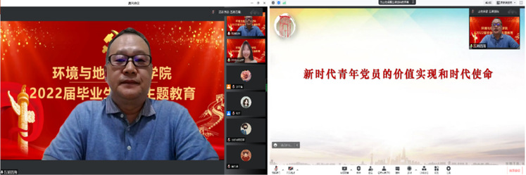 为进一步增强毕业生党员的身份意识,坚定理想信念,强化责任担当,6月12日下午,环境与地理科学学院2022届毕业生党员主题教育在线上召开。活动由学院党委副书记张红主持,学院党委组织员郭文倩、全体2022届毕业生党员参加了此次活动。此次活动还特别邀请了中共上海市委党校(上海行政学院)后勤保卫处处长、党支部书记黄辞海为毕业生党员进行主题教育。