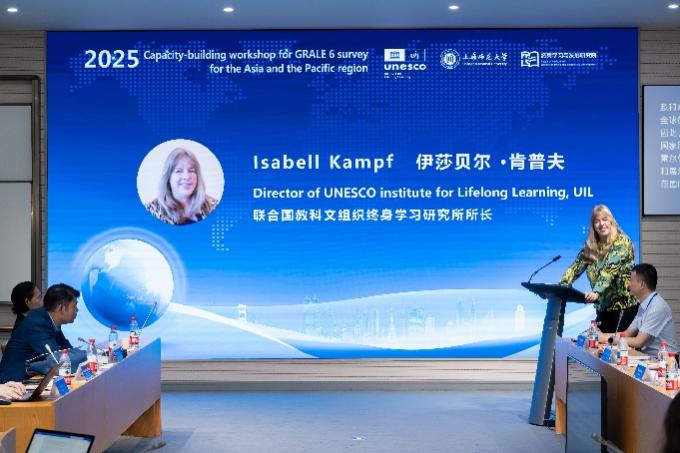 联合国教科文组织终身学习研究所所长伊莎贝尔·肯普夫强调,“成人学习与教育从未像现在这样至关重要”。她肯定亚太地区在推进成人学习与教育方面取得的重要进展,同时指出融资、数据可用性以及包容性等挑战依然存在。她表示,此次研讨会将通过加强各国收集可靠、全面、可比数据的能力,为编制具有里程碑意义的GRALE 6奠定基础,并最终推动制定真正反映本地区学习者需求与愿望的政策与实践。伊莎贝尔·肯普夫特别感谢上海师范大学作为核心合作伙伴的“invaluable support(不可或缺的支持)”。