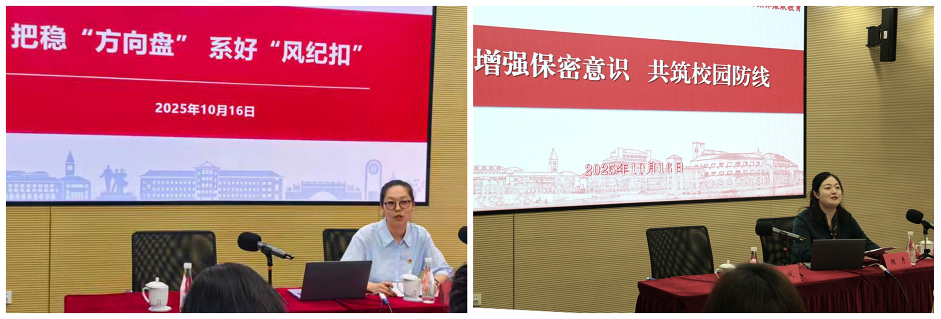颜彦作题为《增强保密意识,共筑校园防线》的专题讲座。她深入阐述了当前保密工作面临的严峻形势和增强保密意识的重要性,并紧密结合高校工作实际,详细讲解了如何层层落实保密责任、全面提升防范能力,共同筑牢维护校园安全和国家安全的坚固屏障;明确提出了“科研领域守牢红线、教学领域遵循基线、对外交流把稳底线、网络领域加强防线”的保密工作要求。