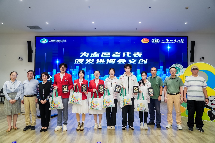 为了增强“小叶子”们的归属感和集体荣誉感,学校特别打造了以“8”为主题融合上海师大元素的系列特色文创,包括帆布袋、拼接徽章、行李牌和颈枕。学生工作部(处)长朱政、保卫处处长倪锋、奉贤校区管委会副主任施家仓、宣传部副部长傅昕源、国际交流处副处长王正海、后勤服务中心副主任郭文为志愿者代表颁发文创。