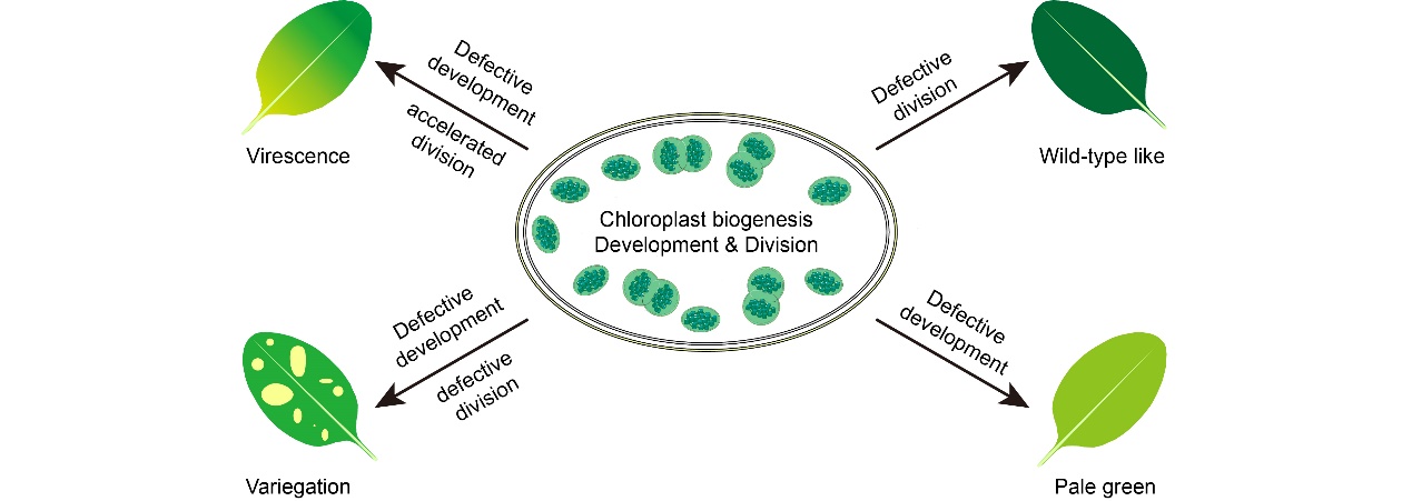 综合以上结果,团队从叶绿体生物发生的角度提出了叶色形式的模型:只有在叶绿体发育与分裂同时缺陷时,才会形成斑叶表型;若单一过程缺陷,则表现为淡绿色或正常绿色。