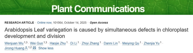近日,我校生科院黄继荣团队在Plant Communications发表了题为 Arabidopsis leaf variegation is caused by simultaneous defects in chloroplast development and division的研究论文。该研究揭示斑叶表型并非由传统认知的单一发育缺陷导致,而是叶绿体发育与分裂两个过程同时受阻的结果;还发现了光信号通路因子COP1突变可逆转斑叶表型,而VAR2/FtsH2蛋白能与自噬关键蛋白 ATG8a互作来调控叶绿体分裂。这项工作为理解叶绿体生物发生及叶片颜色的调控机制提供了新视角。