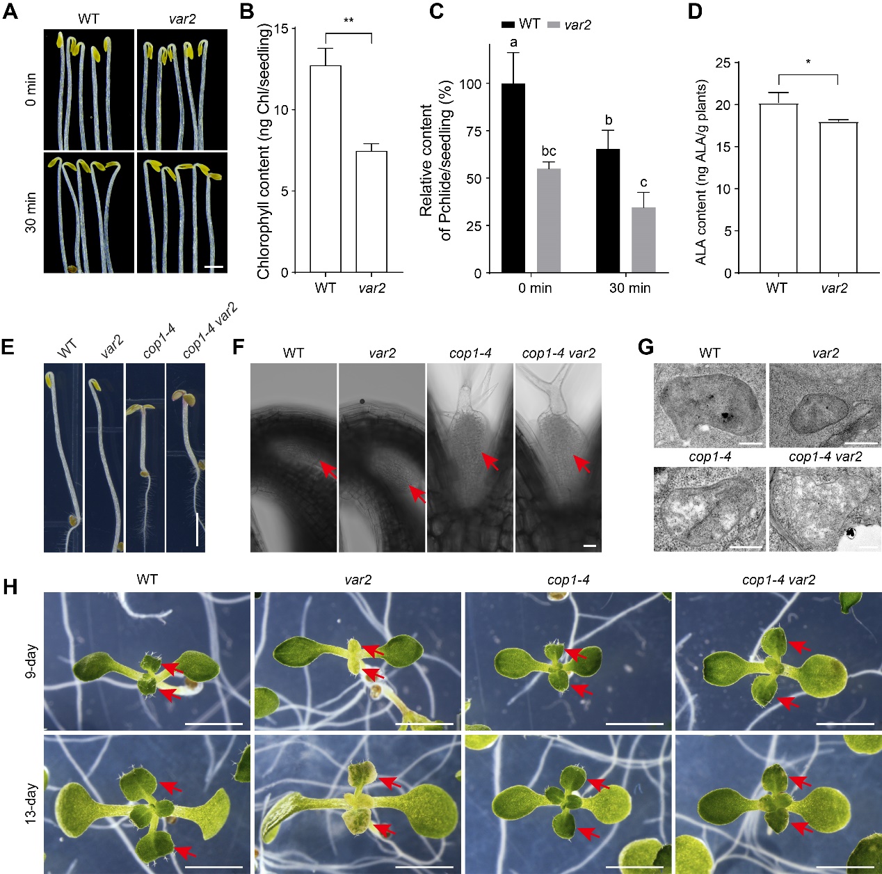 为验证分裂缺陷对斑叶表型的影响,团队构建了var2与叶绿体分裂关键基因(ARC6、PARC6、PDV1、PDV2)的双突变体。遗传分析显示,PARC6或 PDV1突变会显著加重var2的斑叶表型;反之,过表达PDV1或PDV2则能有效回复var2的斑叶表型。这表明叶绿体分裂能力与var2的斑叶严重程度直接相关。同时,团队还发现VAR2突变会抑制茎尖分生组织中原质体向叶绿体的转化及子叶中黄化质体的发育,而在var2背景中导入cop1-4 (光形态建成核心抑制因子),cop1-4完全回复var2黑暗中黄化质体的发育以及正常光下的斑叶表型,表明COP1突变可以拮抗VAR2突变对叶绿体发育的抑制作用。