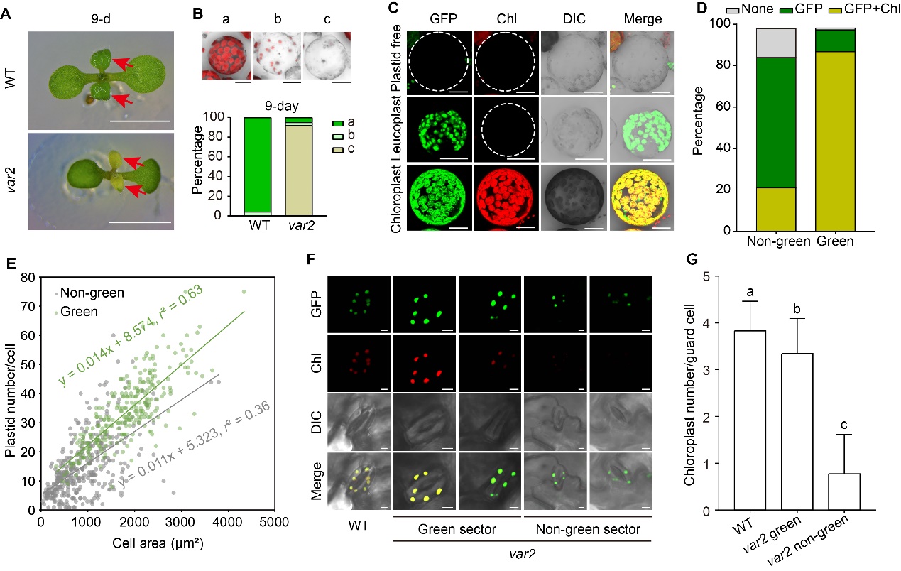 为验证上述假说,研究团队以拟南芥var2为模型,首先通过激光共聚焦显微镜和透射电镜系统解析了每个叶片细胞中的叶绿体数目,分析发现var2突变体的叶绿体发生存在双重缺陷:在发育上,突变体第一对真叶幼苗期(9天)超过90%的细胞完全缺失叶绿体,而在成熟叶片绿色区域的细胞中叶绿体发生也显著延迟且异质性极高;在分裂上,突变体成熟叶片的非绿色区域约 15%的细胞完全不含质体,保卫细胞中的叶绿体数量也显著减少。这些结果表明VAR2突变同时破坏叶绿体的发育与分裂。