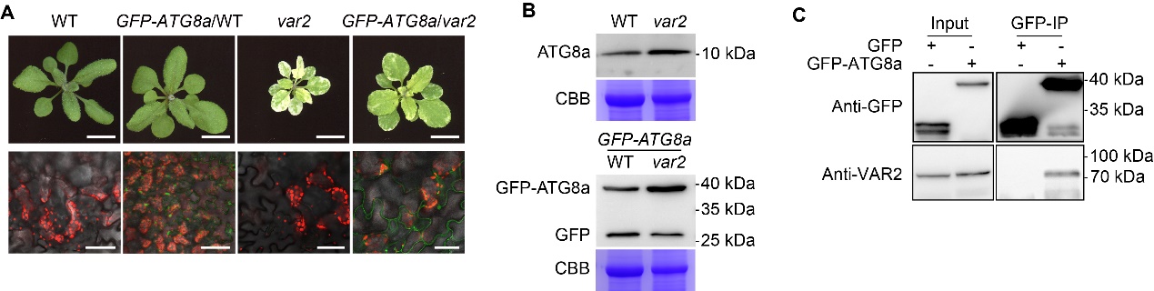 最后,团队探索了VAR2调控叶绿体分裂的机制,发现自噬相关基因ATG8a与VAR2存在功能关联。过表达ATG8a可显著抑制var2斑叶,并且增加野生型和var2的叶绿体数量;var2中 ATG8a的降解产物减少,表明VAR2突变降低了自噬活性;CoIP实验证实,VAR2与ATG8a在体内形成复合物,揭示了VAR2通过与ATG8a互作调控自噬依赖的叶绿体分裂通路。