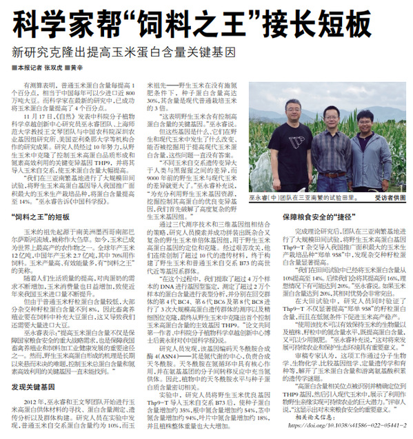 中国科学报(头版头条):科学家帮“饲料之王”接长短板 新研究克隆出提高玉米蛋白含量关键基因