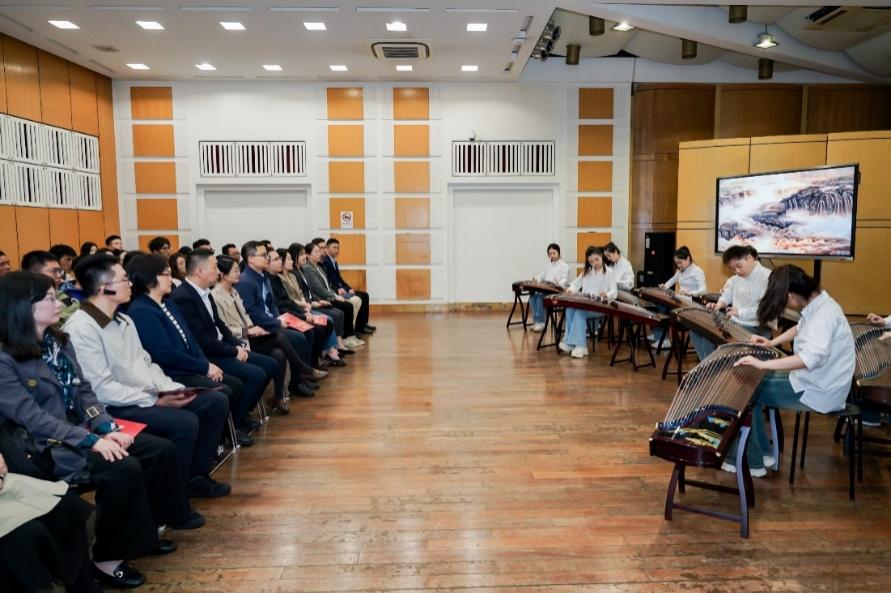 最后,考察组一行来到小音乐厅,欣赏了由我校音乐学院玉兰筝团带来的古筝重奏《黄河》,展现学校通过主动排演主旋律艺术作品,弘扬爱国主义教育,着力培养合格的社会主义艺术工作者的教学成果。