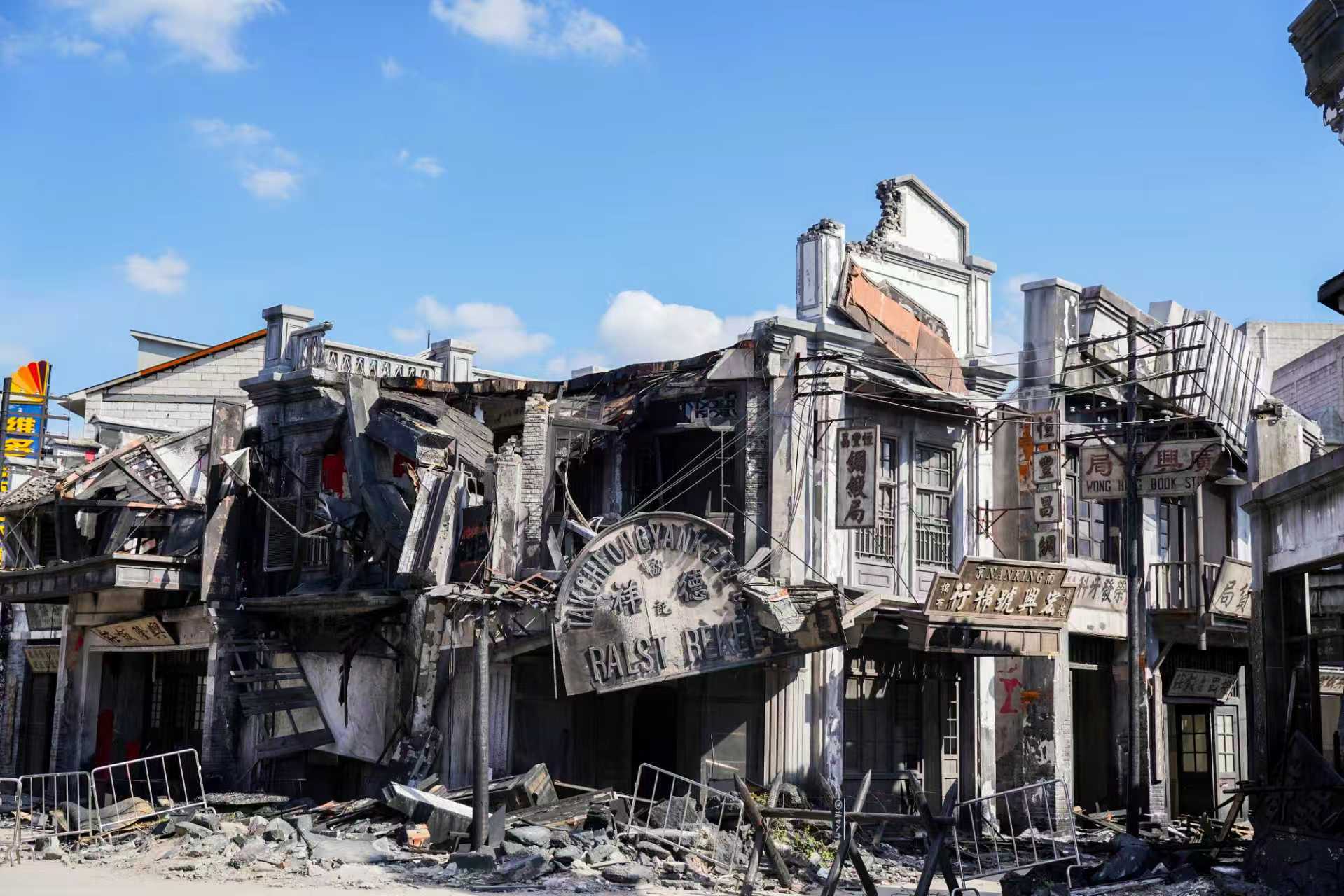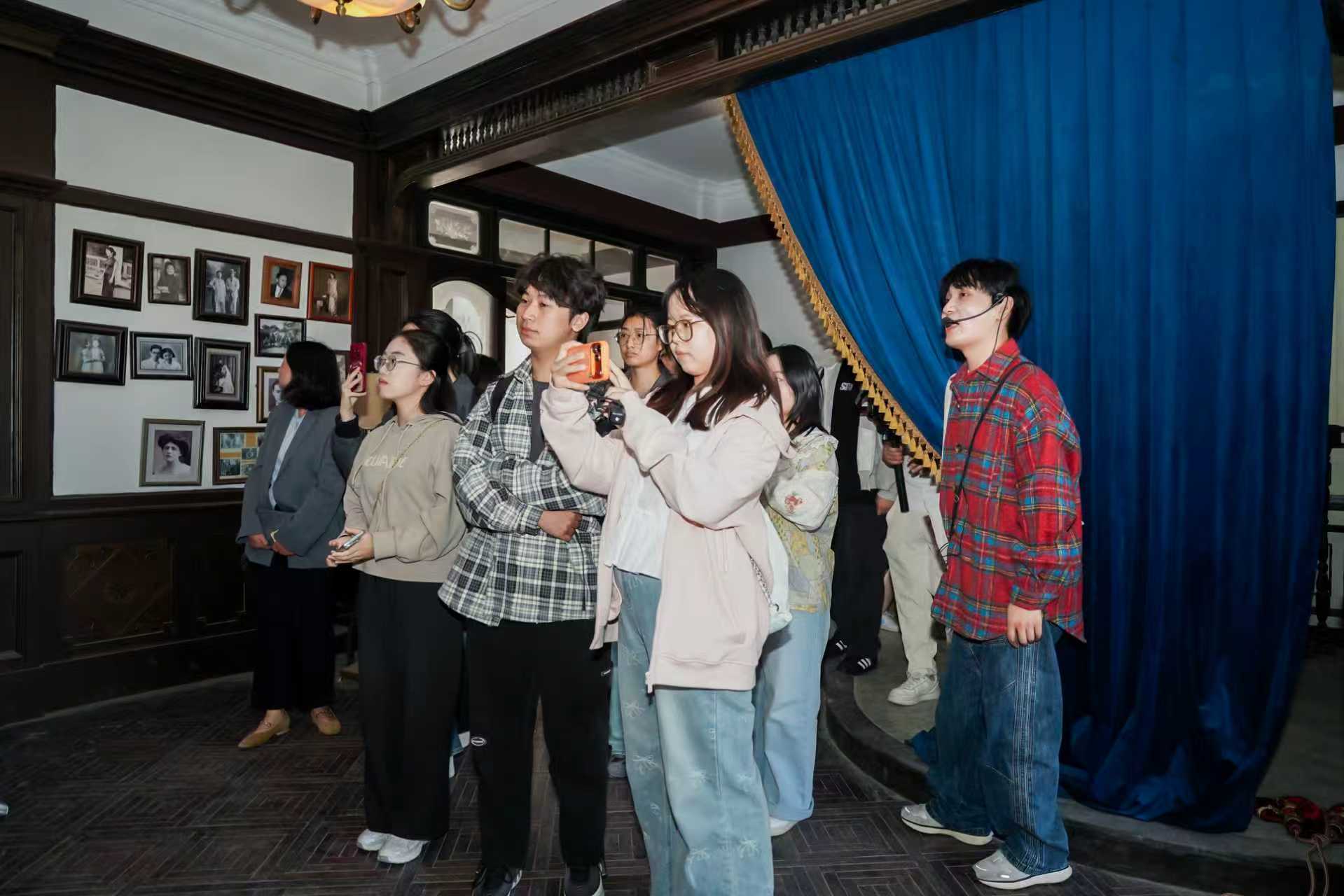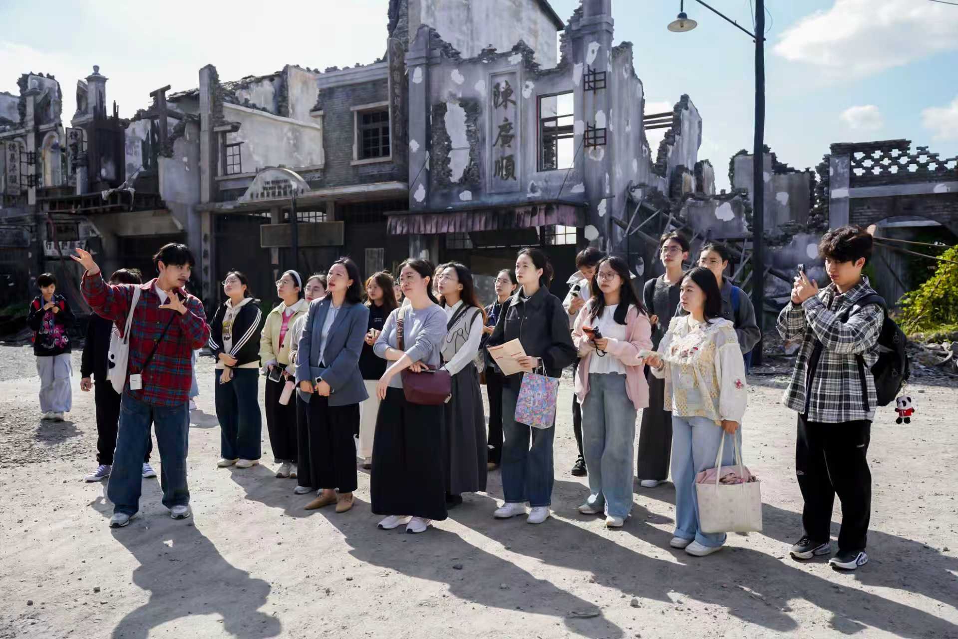 活动伊始,师生们参观了电影《南京照相馆》的拍摄实景,置身于1:1高度复刻的断壁残垣,呈现在眼前斑驳的砖面、焦黑的弹孔,瞬间将时空拉回到了1937年的南京。走到电影最核心的拍摄地——吉祥照相馆里时,同学们驻足在北平故宫、杭州西湖、上海城隍庙等背景布前,电影中那一声“大好河山,寸土不让”的呐喊仿佛再一次回响在每个人的耳畔,触动着在场每一个人的心弦。