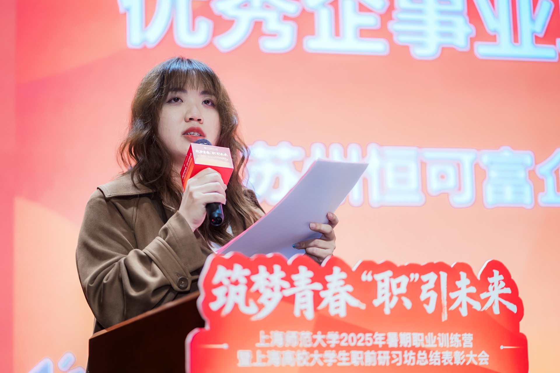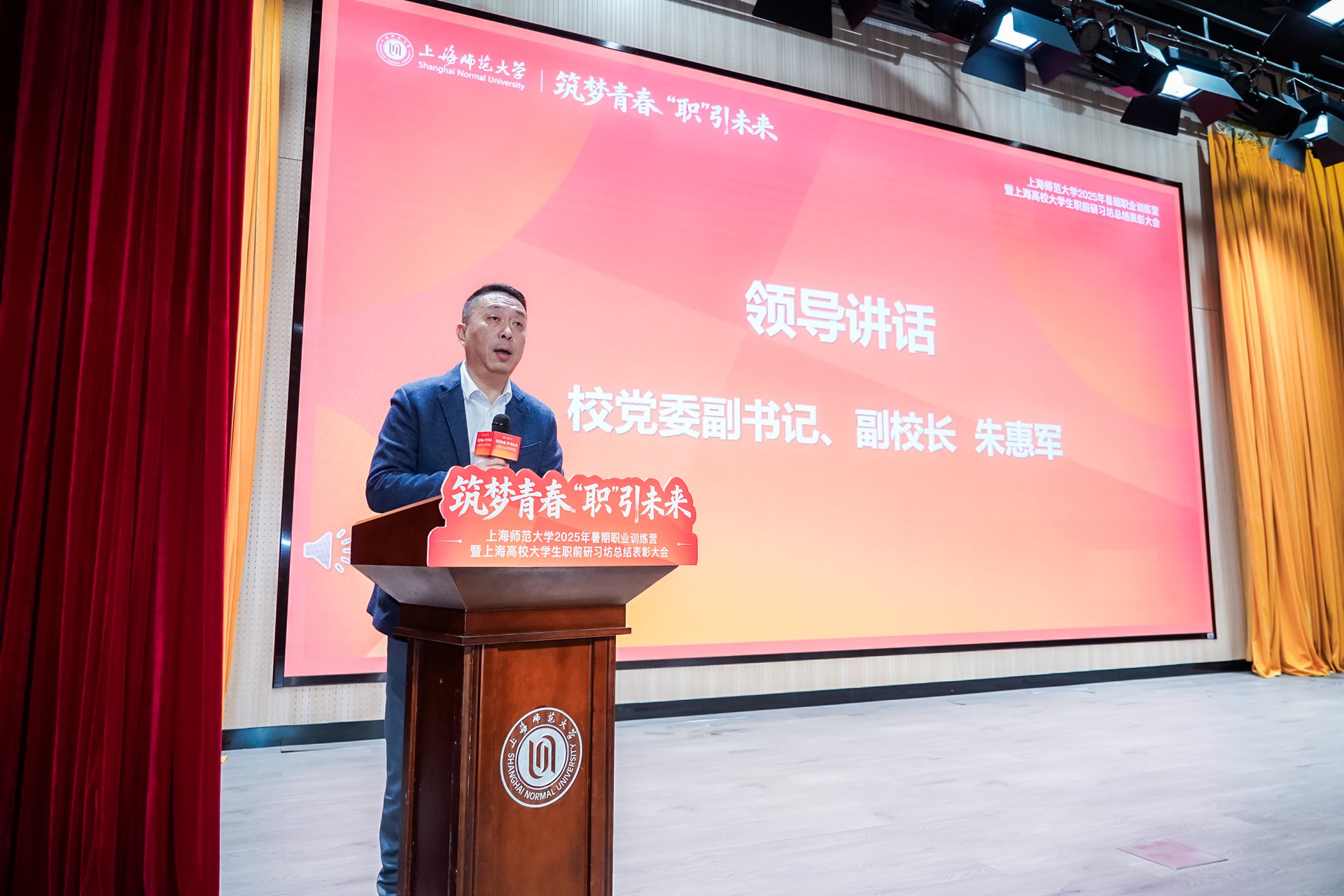 10月29日下午,上海师范大学2025年暑期职业训练营暨上海高校大学生职前研习坊总结表彰大会于徐汇校区教苑楼C座多功能厅举行。校党委副书记、副校长朱惠军,上海市妇女联合会发展联络部一级主任科员夏敏慧,上海市女企业家协会副秘书长、“海鸥计划”联络人季虹,上海市学生事务中心调查评价部部长杨彦辰,企事业单位带教导师代表、相关职能部门负责人,以及各学院学生工作副书记、负责人、就业专职辅导员和师生代表出席本次活动。