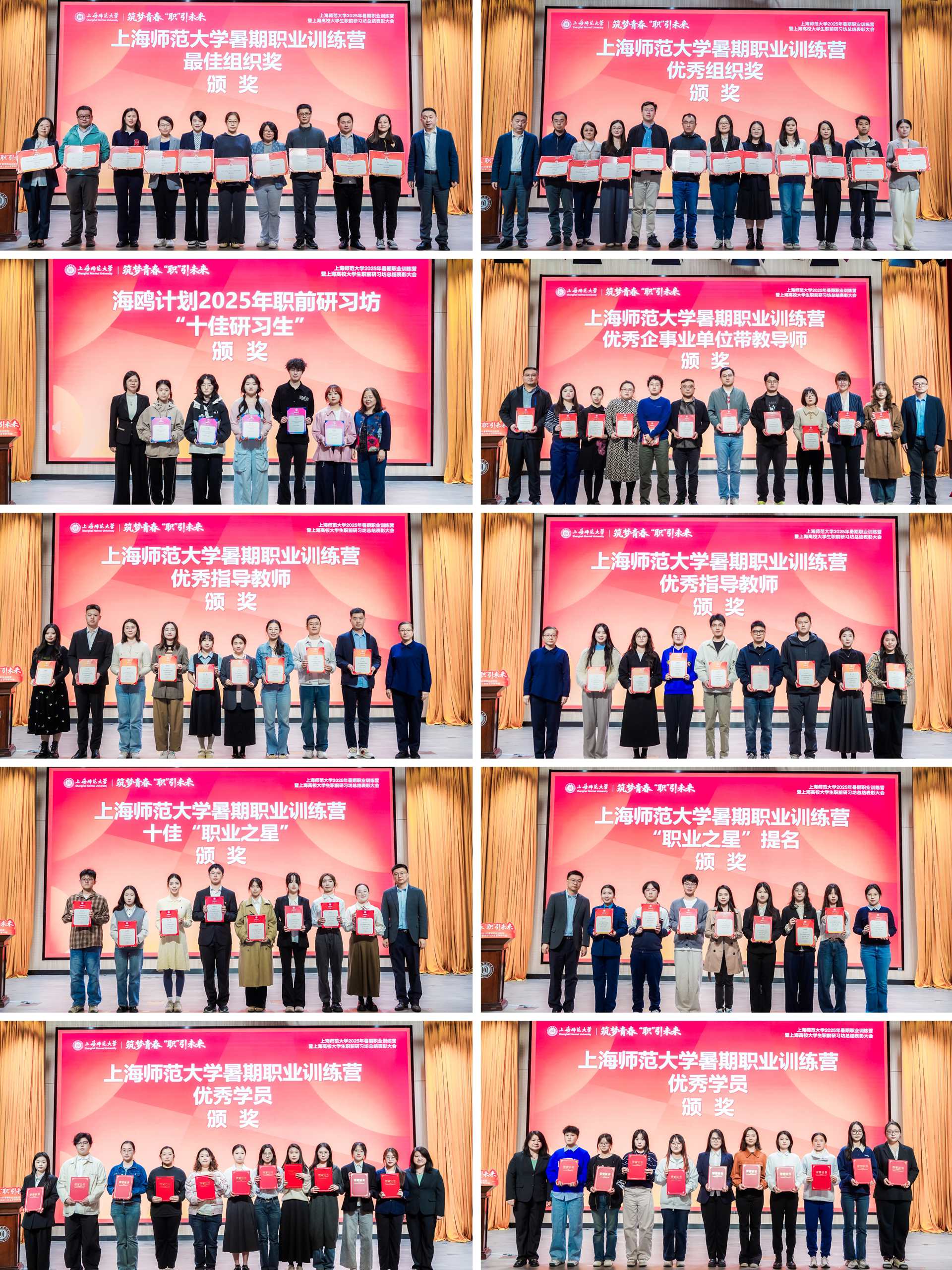 在上海高校大学生职前研习坊与校暑期职业训练营中,涌现出一批表现突出、成绩优异的优秀代表。活动现场表彰了校暑期职业训练营最佳组织奖及优秀组织奖、优秀企事业单位带教导师、优秀指导教师、十佳“职业之星”及提名、优秀学员代表及海鸥计划2025年职前研习坊“十佳研习生”代表。
