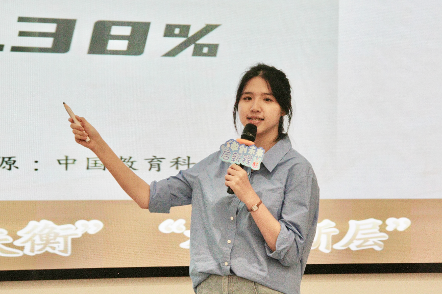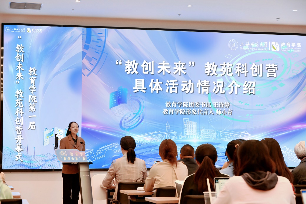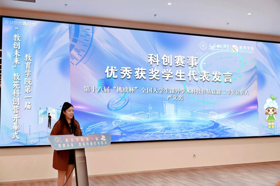 教育学院团委书记王诗婷与学院AI数字人“师小育”共同介绍本届科创营的活动情况,包含:赛事讲座夯实基础、案例观摩开拓视野、实地探访激发灵感、导师指导生成选题、模拟路演打磨项目五大板块,与学院侧重教学基本功的卓越训练营形成协同增益,着力培养“教学+科研”的复合型教育人才。