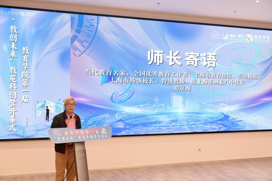 为激发师范生创新意识、提升科研能力与实践本领,10月29日下午,教育学院在奉贤校区大学生发展中心B座108举办首届“教创未来”教苑科创营启动仪式。当代教育名家、全国优秀教育工作者、上海市教育功臣、劳动模范、上海市特级校长、特级教师、上海市闸北八中原校长刘京海,校党委副书记、副校长朱惠军,教育学院党委副书记(主持工作)吴跃东,校教务处副处长邱乙哲,上海师范大学附属中学党委副书记何潇,教育学院教师及学生代表出席本次活动。启动仪式由教育学院学生工作负责人潘梦琳主持。