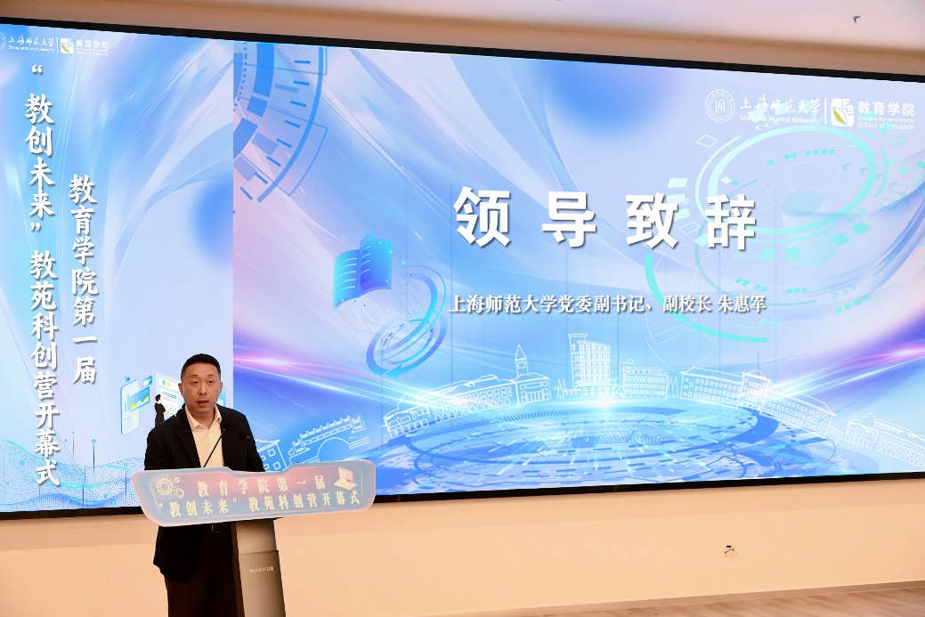 朱惠军在致辞中指出,我校始终坚持以立德树人为根本任务,以推动教育创新为己任,努力培养具有家国情怀、创新精神和实践能力的卓越教师与未来教育家。他充分肯定了近年来教育学院在学生科创赛事上取得的不俗成绩,寄语同学们要紧握时代机遇,勇于“破圈出圈”、坚持“问题导向”、学会“团队作战”,在“教创未来”的旅程中,不仅收获知识与技能,更能培养系统性思维、塑造坚韧品格与凝聚团队精神,真正成长为“会创新、能育人”的时代新人。
