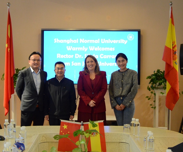 卡拉斯卡尔校长对我校的热情接待表示感谢。她特别提到,上海师范大学是她此次中国之行到访的第一所高校,初访便感受到学校的深厚底蕴与开放氛围,对两校合作充满期待。随后,她介绍了西班牙圣乔治大学的发展历史、办学理念,以及学校在教学实践中与中国企业开展的合作。同时,卡拉斯卡尔校长还分享了圣乔治大学当前在中文教学领域面临的资源不足与发展需求,明确表达了希望与我校在中文教学资源共享、师资培训等方面开展合作的意愿,助力该校提升中文教学水平。