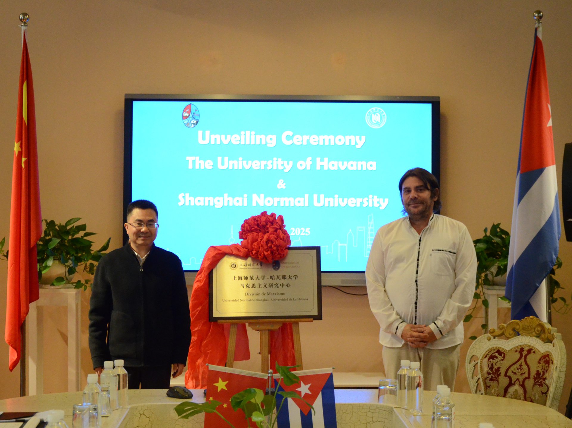 会谈结束后,双方代表共同为两校“高等教育科学联合中心”和“马克思主义研究中心”揭牌。此次揭牌标志着双方合作进入实质性推进阶段,为未来深化教育、科研领域合作搭建了重要平台,对推动两校国际化发展及区域高等教育交流具有重要意义。