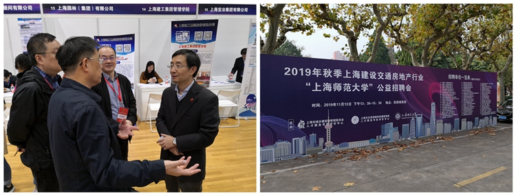 11月13日下午,为搭建毕业生与用人单位沟通的桥梁和纽带,拓宽毕业生就业市场,促进提高毕业生的就业率和就业质量,实现毕业生与用人单位双向选择、互利共赢。学校主动对接上海市城乡建设和管理委员会人才服务考核评价中心、上海市住房保障和房屋管理局人才服务考核评价中心,通过学生职业发展与就业指导中心、建筑工程学院的共同努力,联合举办了2019年秋季上海建设交通房地产行业“上海师范大学”公益招聘会。校党委副书记、副校长葛卫华到场指导工作,并与建交委人才中心、房管局人才中心相关负责人亲切交谈。