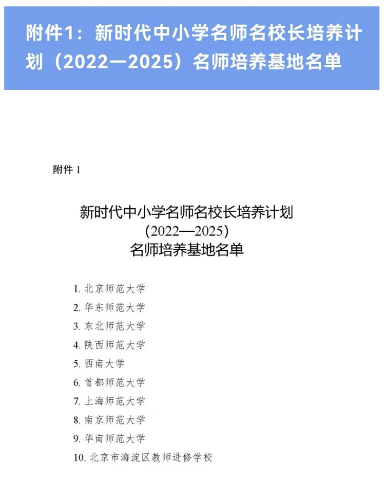 为深入学习贯彻党的二十大精神,落实习近平总书记关于教育的重要论述,落实《中共中央国务院关于全面深化新时代教师队伍建设改革的意见》和《新时代基础教育强师计划》,根据《教育部办公厅关于实施新时代中小学名师名校长培养计划(2022—2025)的通知》(教师厅函〔2022〕18号,简称“双名计划”)要求,我校教育学院王荣生教授领衔的培训团队经申报与答辩等遴选环节,最终与北京师范大学、华东师范大学等10家单位成为名师培养基地。