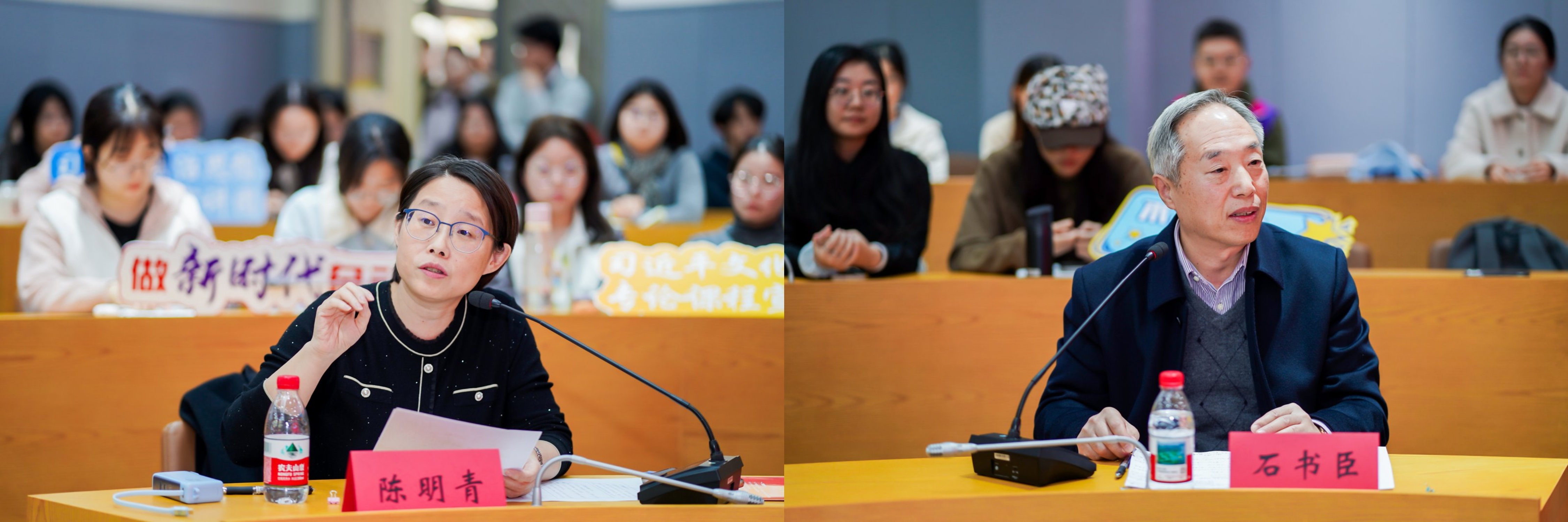 华东师大一附中副校长、正高级教师、我校1994级思想政治教育专业优秀校友陈明青,上海师范大学马克思主义学院教授、博士生导师石书臣分别从选题价值、学理支撑、宣讲技巧等方面进行点评。陈明青聚焦 “如何讲好”,从内容呈现、表达技巧到场景适配,给出了接地气、可操作的具体建议。石书臣立足马克思主义理论专业视角,从课程逻辑架构、核心要义内涵阐释的精准把握等方面点明了宣讲课程进一步优化的方向。