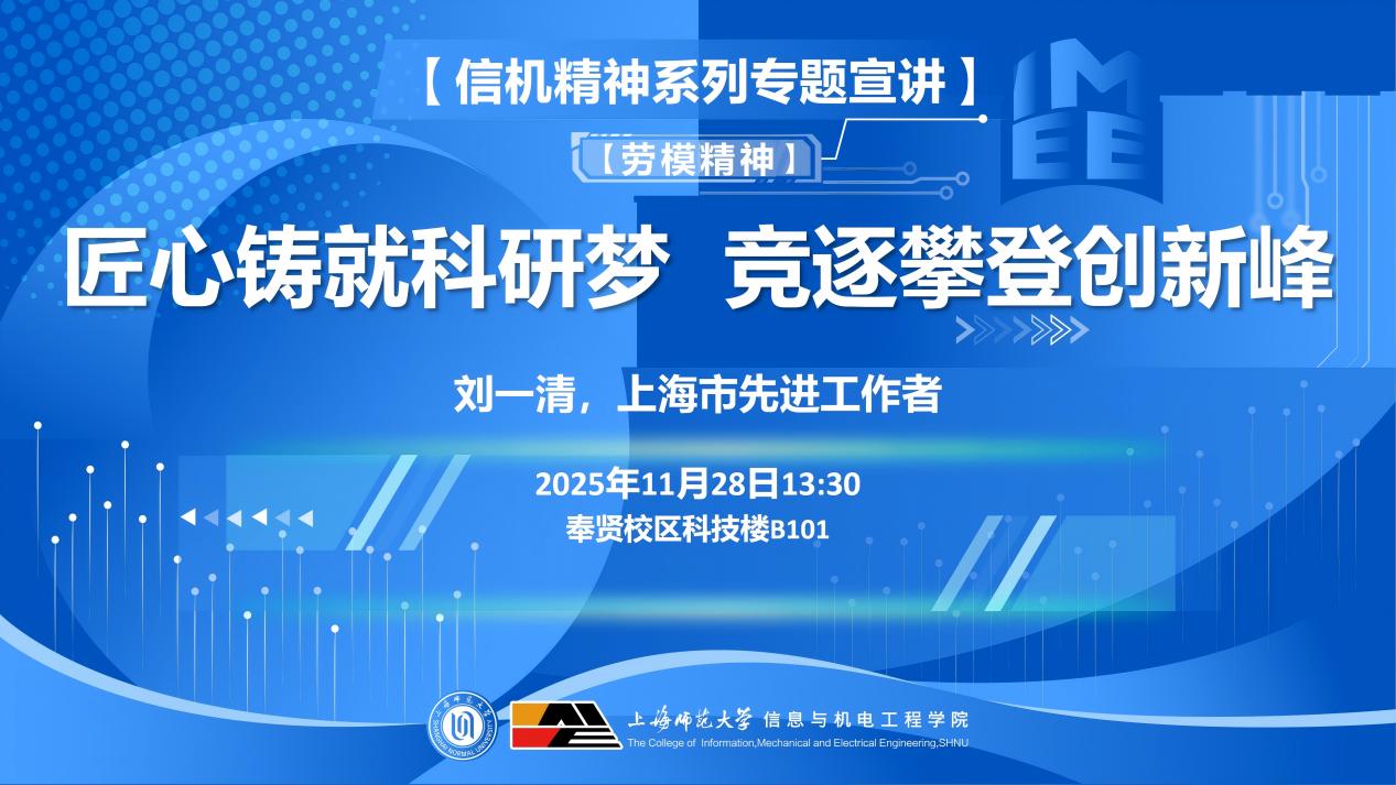 为弘扬新时代劳模精神,激发师生科研创新热情,11月28日下午,信息与机电工程学院特邀上海市先进工作者、华东师范大学教授刘一清做客学院人生导师沙龙活动,以“匠心铸就科研梦 竞逐攀登创新峰”为主题,为师生分享科研育人经验与创新实践成果,为在场师生勾勒出一幅以劳模精神驱动科技创新的实践图景。学院青年师生代表近百人参加,活动由学院青联会执委吴天祥主持。