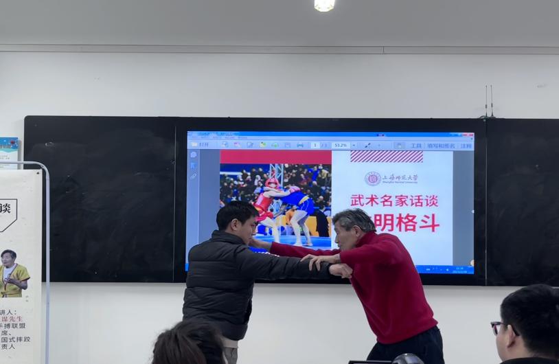 袁祖谋以视频引入,为大家介绍了手搏的基本技术,随后邀请学生共同展示手搏技艺,招式虽简,却难掩深厚功底,耄耋之年,却难掩矫健身姿。袁先生表示他将继续奋力前行,把中国武术推向世界舞台。