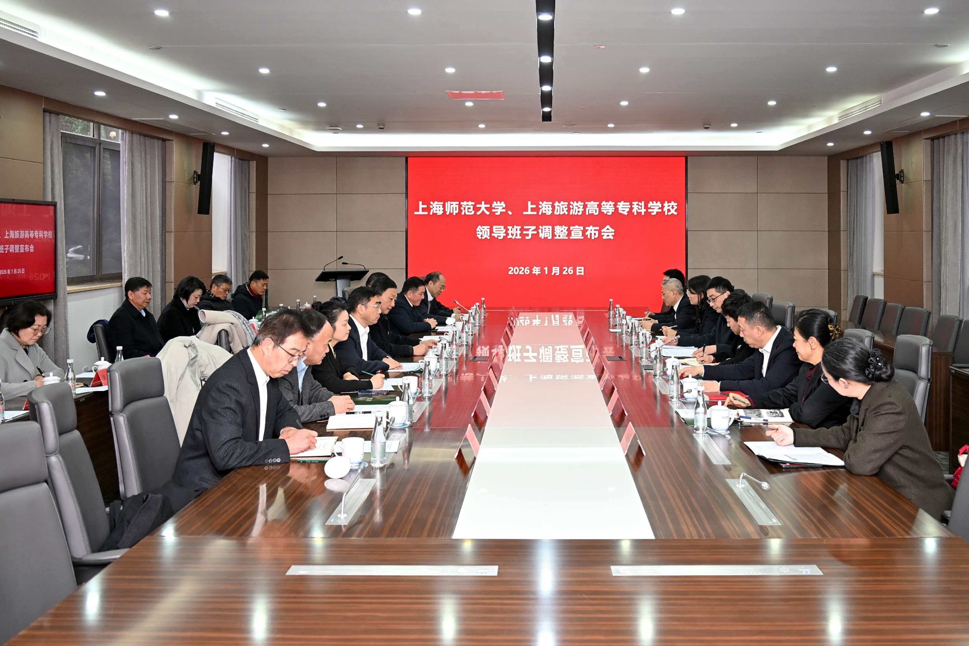 1月26日下午,上海师范大学领导班子调整宣布会在徐汇校区外宾楼101会议室召开。会议宣布上海市委决定:张叶江同志不再担任上海师范大学党委副书记、纪委书记职务;康年同志不再担任上海师范大学副校长、上海旅游高等专科学校校长职务;赵扬同志任上海师范大学党委副书记、副校长;滕云同志任上海师范大学党委副书记、纪委书记;李国娟同志任上海师范大学副校长;朱惠军同志任上海旅游高等专科学校校长,不再担任上海师范大学党委副书记职务。