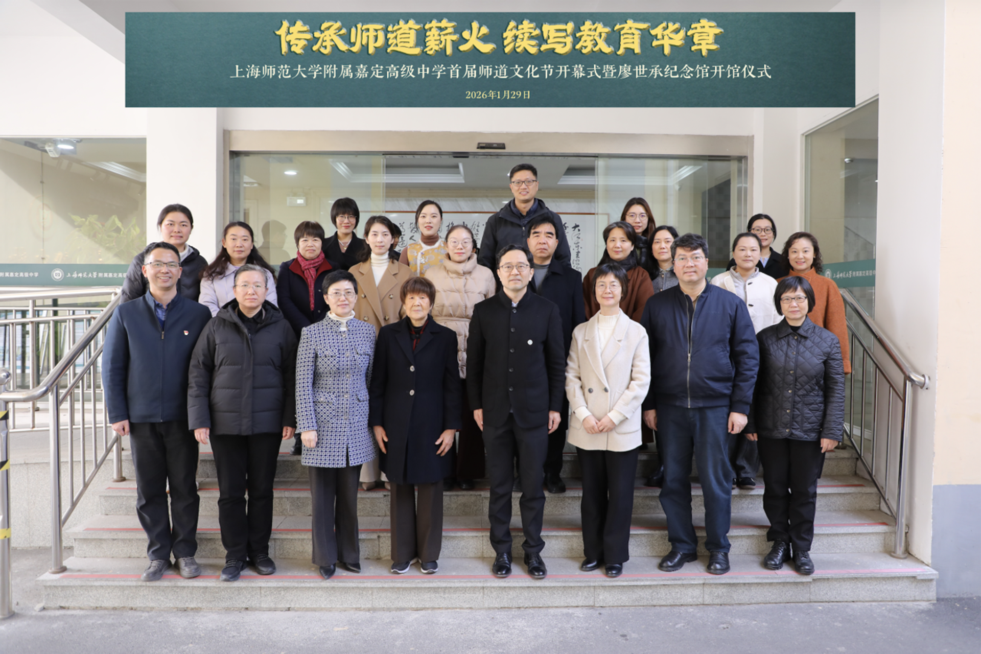 1月29日下午,上海师范大学附属嘉定高级中学举行首届师道文化节开幕式暨廖世承纪念馆开馆仪式。出席仪式的有嘉定区教育局副局长李娟,嘉定镇街道党工委委员、街道办事处副主任冯晴,教育局基教科科长凌雪花,博物馆馆长王新宇;上海师范大学统战部部长周理,教师工作部部长贺朝霞,宣传部副部长傅昕源,教师工作部副部长公磊,基础教育处挂职副处长冯朝君;上海市生态学学会理事潘丽珠,以及上海师大教师工作部、基教处、档案馆、基础教育发展研究院和上海师大嘉定基教集团成员校校长等。本次活动特邀廖世承先生的孙女廖有庆女士出席,与全校师生共同见证这一重要时刻。