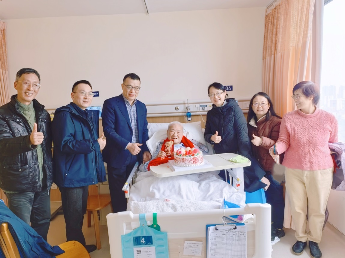 校党委书记林在勇、校长陈恒、副书记杨海燕、副校长蒋明军等领导班子成员先后看望了学校离休干部、老领导、劳模、老教授以及大病、生活困难的老同志代表,把组织的温暖和节日的祝福及时送达。在100岁高龄的老党员、原历史系教授赵宗颇老师的病房里,陈恒校长代表学校送上寓意福寿安康的百岁生日蛋糕以及绣有上海师范大学校徽的红围巾。他俯身紧紧握住赵老师的手,动情地说道:“赵老师,您为学校历史学科建设做出了重要贡献,您一辈子深耕讲台、潜心治学,为国家和社会培养了大批栋梁之才,学校永远铭记您的贡献,衷心祝您生日快乐、福寿绵长、阖家幸福!”,并与赵老师亲切合影留念。随后他还俯身关切地询问赵老师的饮食起居与身体状况,叮嘱职能部门、学院要关心照顾好,让老教授深切感受到学校的关怀与问候。