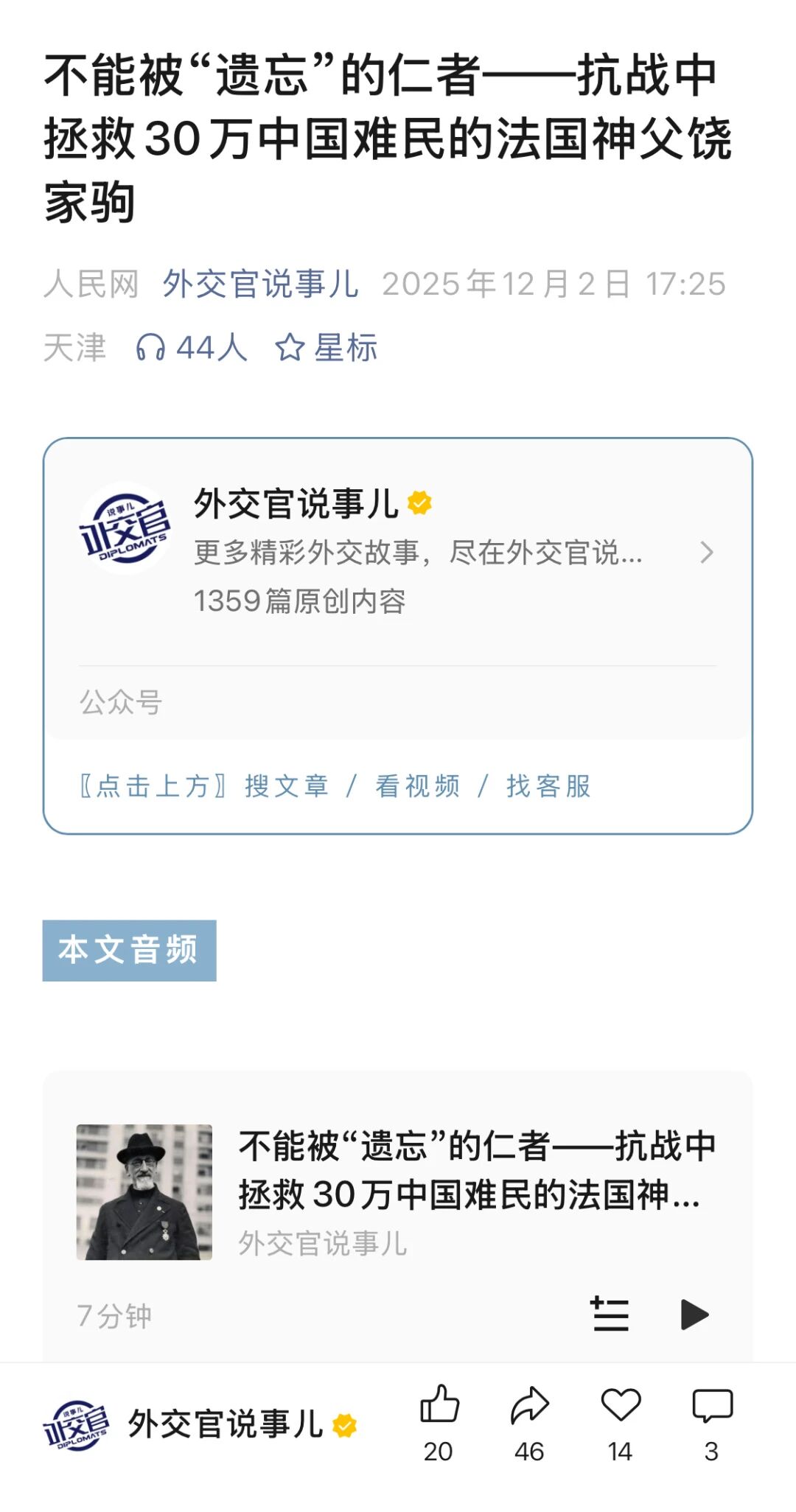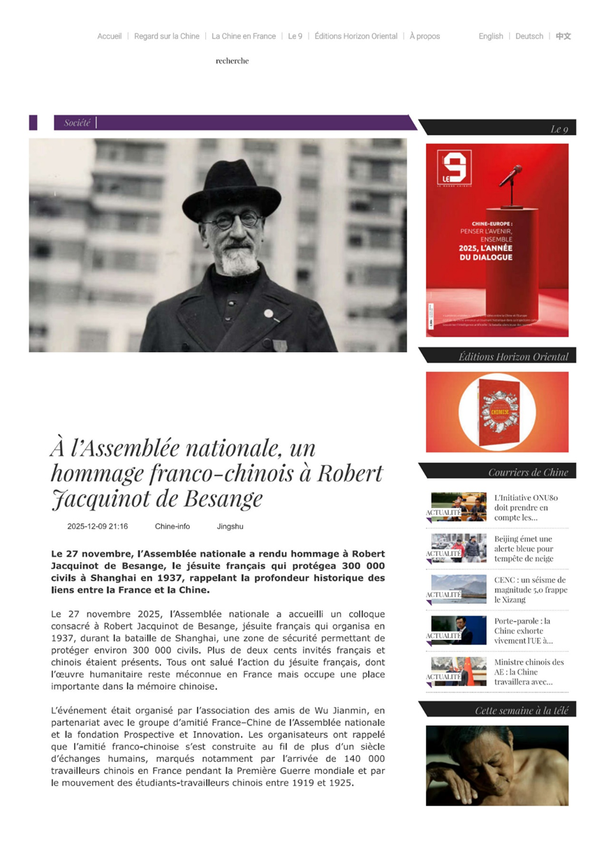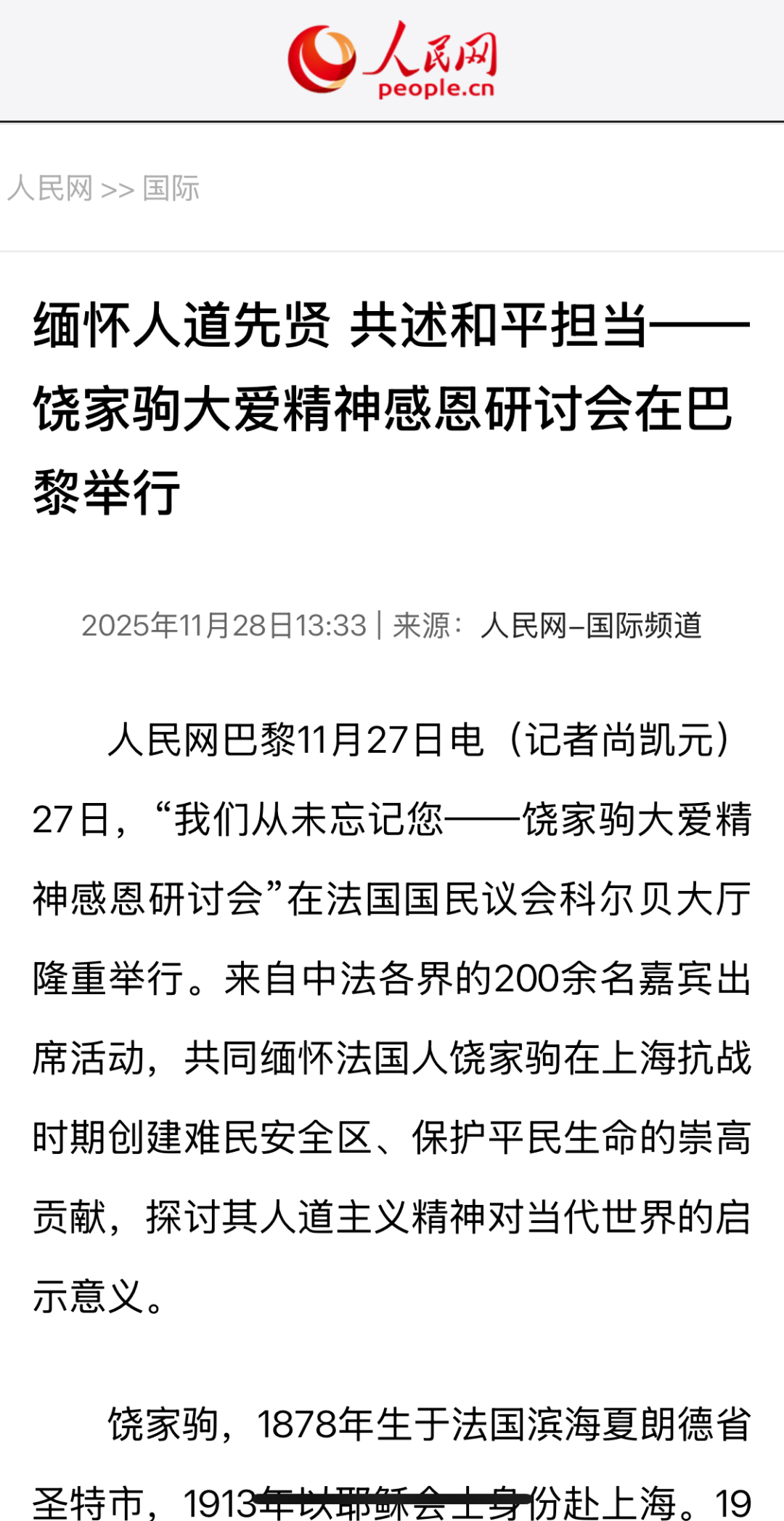 基于扎实的学术研究,本项目于2025年11月27日,在法国国民议会科尔贝大厅成功举办了“感恩饶家驹上海南市安全区研讨会”。这是首次在饶家驹的故乡法国举办国际纪念活动,更是首次在法国最高立法机构讲述这段源于上海的感人历史。法国前总理拉法兰、国民议会法中友好小组主席马亚尔等政要,以及中法两国历史学家、艺术家、教育界人士等200余位嘉宾出席。拉法兰先生高度赞扬了其同乡前辈饶家驹的善举,并指出在当今时代,这样的精神更显珍贵。活动现场播放了由苏智良教授团队制作的短片《饶家驹与上海安全区:被遗忘的英雄》。