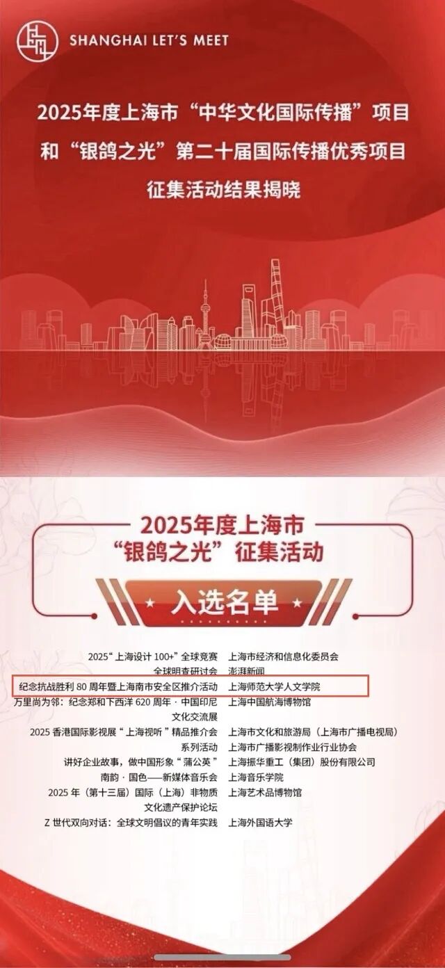 近日,2025年度上海市“中华文化国际传播”“银鸽之光”第二十届上海市国际传播优秀项目征集活动结果揭晓。由我校人文学院苏智良教授团队报送的“纪念抗战胜利80周年暨上海南市安全区推介活动”项目荣获“国际传播活动(优胜项目)”。这个奖项的背后,是一段尘封近九十年的历史与一场跨越中法两国的深情致敬。