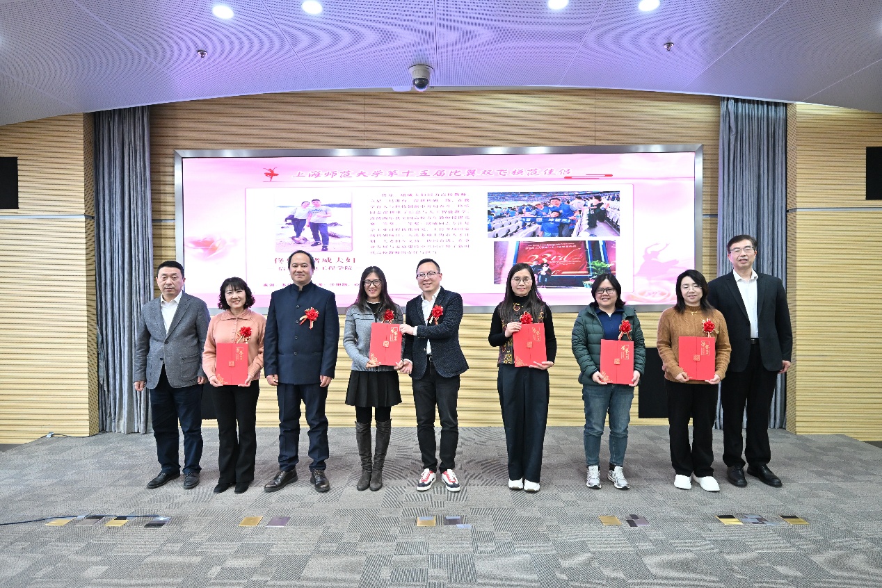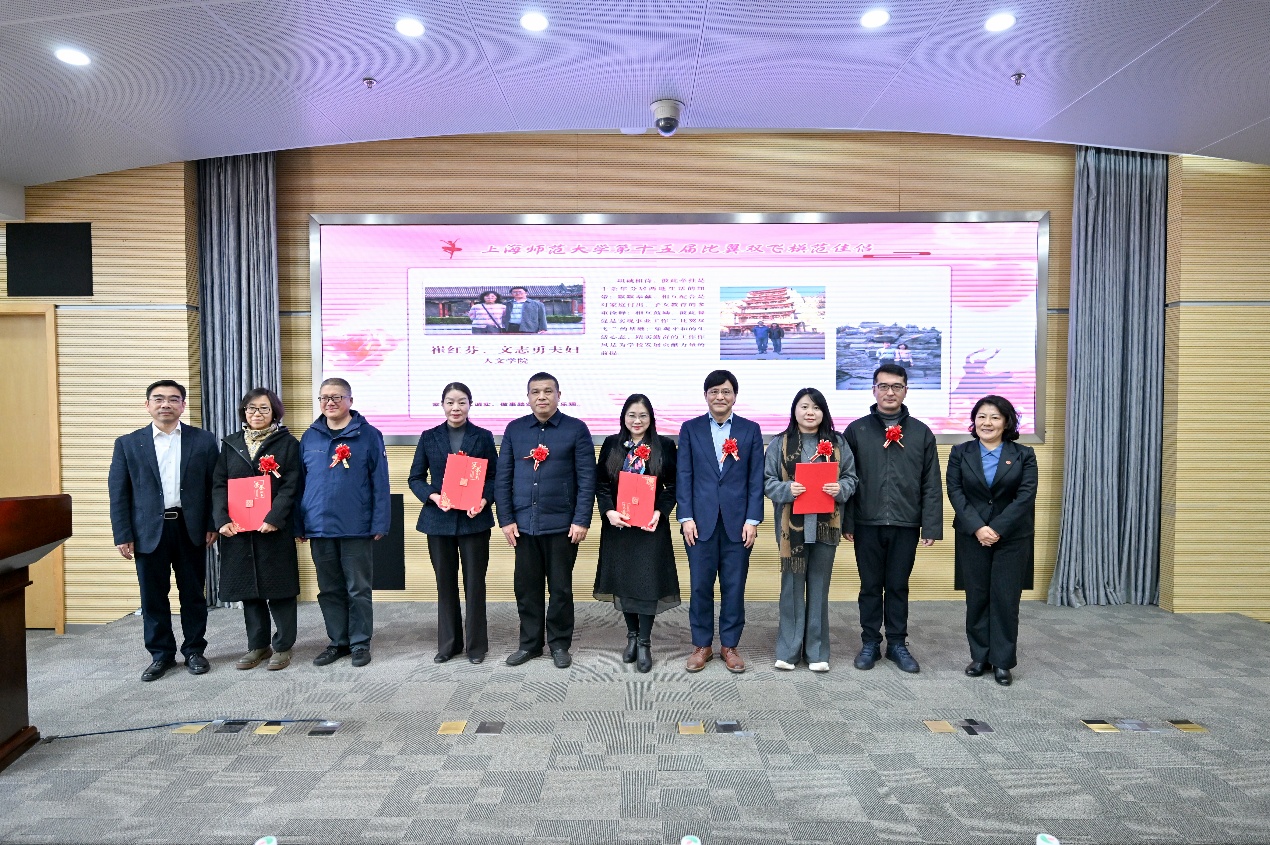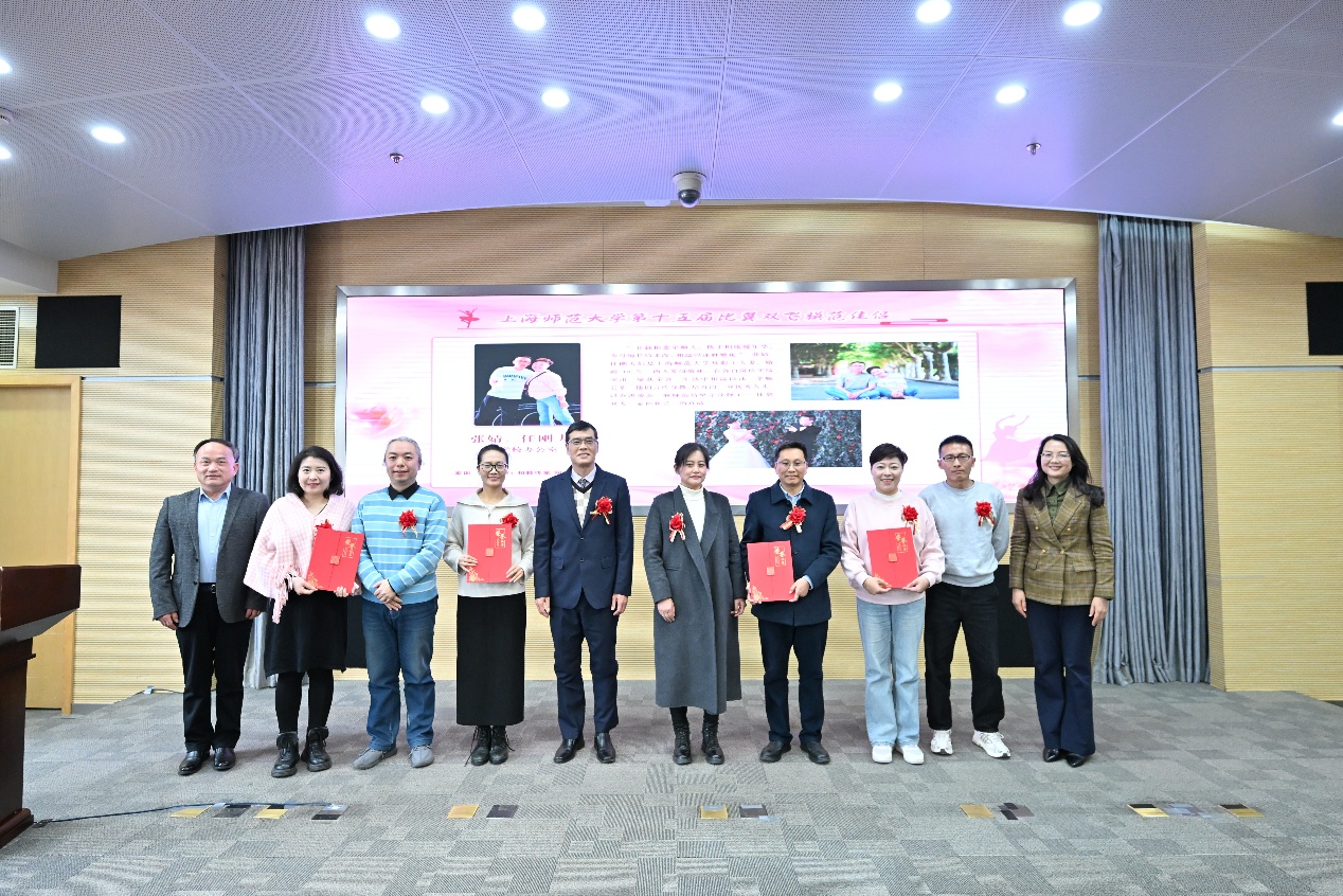 党委副书记杨海燕宣读了表彰决定。生命科学学院王文琴教授荣获“2022-2024年度上海市三八红旗手”称号;外国语学院卢敏、朱伊革夫妇荣获“上海市教育系统第十五届‘比翼双飞模范佳侣’”称号;人文学院崔红芬、文志勇等15对夫妇荣获“上海师范大学第十五届比翼双飞模范佳侣”称号。校领导为获奖先进个人及模范佳侣颁奖并合影留念。