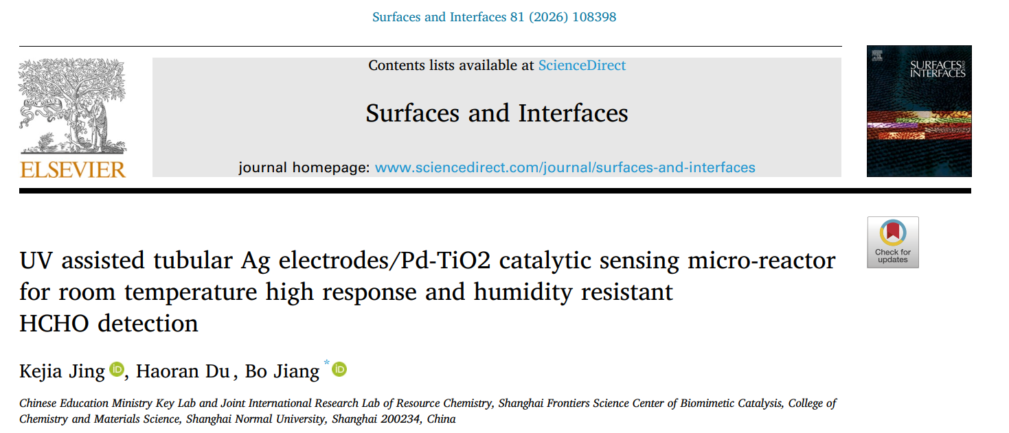 近日,化材学院2022级应用化学拔尖班本科生敬珂嘉以第一作者身份,在国际权威期刊Surfaces and Interfaces上发表了甲醛检测领域的重要研究论文,论文题为“UV assisted tubular Ag electrodes/Pd-TiO2 catalytic sensing micro-reactor for room temperature high response and humidity resistant HCHO detection”,由学院蒋波教授担任指导老师。