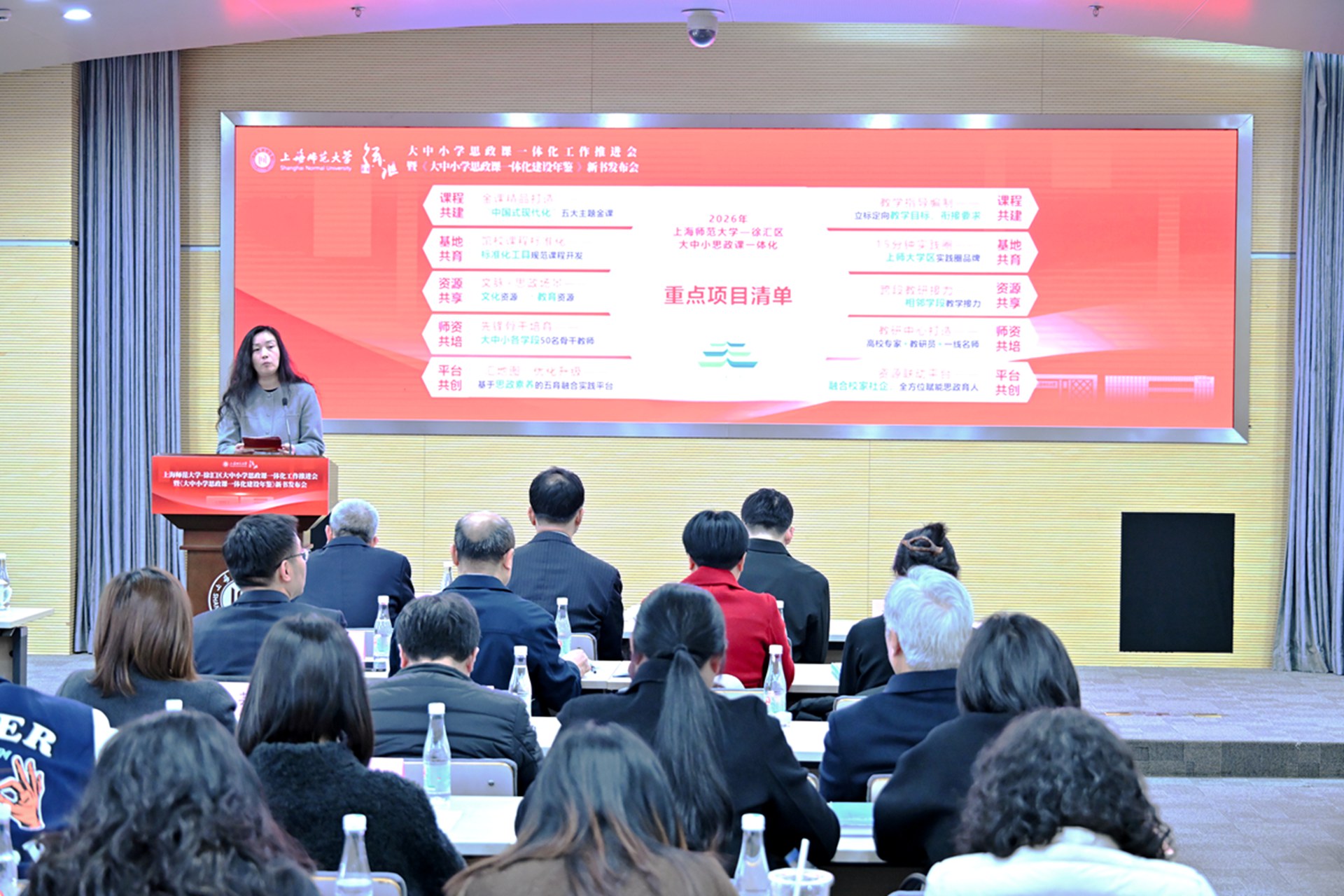 会上,徐汇区教育局副局长林琛介绍了2026年上海师范大学-徐汇区大中小学思政课一体化工作清单。明确了10项重点任务:一是共同开发“中国式现代化”五大主题思政金课;二是联合编制并动态修订《徐汇区大中小学思政课一体化教学指导意见》,立标定向教学目标衔接要求;三是馆校合作建立标准化工具,规范课程开发;四是打造15分钟实践圈,重点打造上海师大学区实践圈品牌;五是创设文脉+思政场景,打通文化资源与教育资源;六是跨段教研接力,打通相邻学段教学壁垒;七是持续开展“先锋班”骨干培育,着力培养各学段50名骨干教师;八是打造联合教研中心,形成高校专家+教研员+一线名师人才队伍;九是“汇地图”优化升级,构建基于思政素养的五育融合实践平台;十是打造资源联动平台,融合校家社企,全方位赋能思政育人。