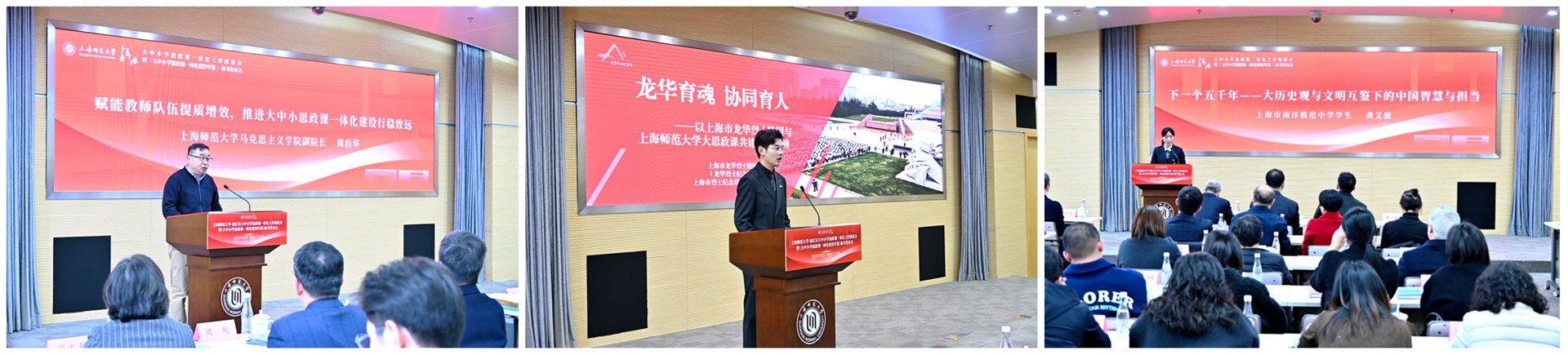 为破解大中小学思政课一体化建设中学段衔接贯通不畅、教师存在壁垒等瓶颈问题,积极探索教研体系创新。会上成立了上海师范大学-徐汇区大中小学思政课一体化建设联合教研中心,上海市教委德育处副处长杨长亮、徐汇区教育局局长周刚、校党委常委、宣传部部长张文潮共同启动中心成立。该中心是上海市首个区校合作建立的大中小学思政课实体化教学研究机构,共建“高校引领、区域统筹、共研联动、一体贯通”教研体系。马克思主义学院院长张志丹、徐汇区教育学院高中思政研训员王志安介绍联合教研中心建设方案及系列思政金课建设情况。中心围绕实体化构建、常态化运行和品牌化打造三个方面重点建设。一是实体化构建。实行院地联合主任负责制,组建以高校教授、基础教育研究专家、中小学思政课教师为主体的人才队伍,开展跨学段协同教研、师资研修、成果培育等工作。二是常态化运行,每月开展有主题的教研活动,计划在三年内实现对徐汇区中小学思政课教师参与中心教研的全覆盖。三是品牌化打造,产出一批高质量一体化教研成果,培育复合型思政课骨干教师,打造市校协同思政教研新模式。