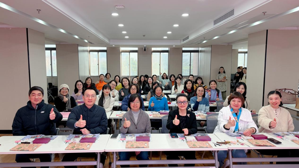 揭牌仪式后,全体女教职工移步文苑楼402室,开启宋锦手作体验之旅。宋锦作为中国传统丝织工艺瑰宝,经纬之间尽显东方美学。大家在手工制作中感受传统技艺魅力,在交流互动中舒缓身心,在一针一线里品味慢时光的美好,现场氛围温馨雅致、其乐融融。