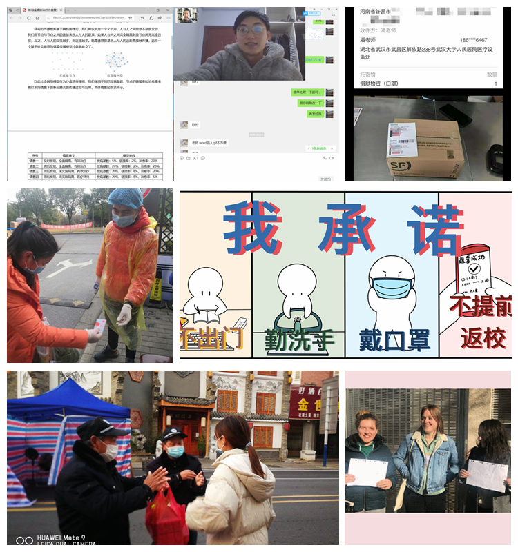 面对突如其然的疫情,商学院学子也积极投入到为疫区捐赠物资和志愿者工作中,为疫情防控尽一己之力。2016级电子商务高远同学在新闻里看到武汉疫情后,了解到目前疫区最紧缺的就是防疫物资,第一时间购买100只口罩并捐赠到武汉大学人民医院。2019级技术经济及管理专业硕士研究生党员吴筱凡,当得知邻居老人很多都没有买到口罩,于是她将新购的大部分口罩都分这些老人们,并叮嘱提醒他们要注意防护。2017级财务管理专业退伍兵周东同学看到社区工作人员紧缺,他主动报名参与小区志愿者,为进出小区的人员量体温、做登记,竭尽所能地为七疫情防控贡献自己的力量。2019级中法经济专业李琬煜同学,不仅承担着抗击疫情的普通志愿者工作,作为九州青阳新青年协会活动部部长,她还先后成功对接多家武汉医院的物资捐赠和采购问题。对于武汉当地的社区,她也积极做好线上社区物资对接工作,成功组织了武汉市江汉区民航里社区捐赠物资活动。对于疫情默默奉献的社区工作人员,她也积极采购面包牛奶等日常用品,为他们送去温暖和爱心。