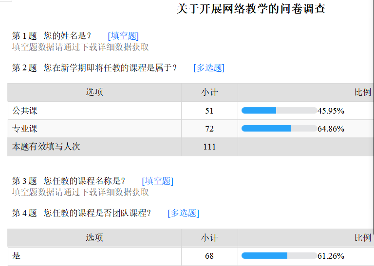 构建远程教学管理机制,强化战“疫”期间服务保障。教学管理团队与学工团队2月4日便第一时间启动远程教学基础情况的排摸。通过问卷星了解老师们远程教学工作的已有资源、实际困难、有益建议等。共收回有效调查问卷111人次,基本做到全覆盖。通过对问卷的科学分析,根据老师们的实际情况和学科特点,精心制定详尽的远程教学方案。特殊战“疫”期间,教学院长、专业负责人、教学团队等专人负责,逐层辐射,落实工作部署。并通过学院工会群、邮件等方式,确保信息通畅,资源分享到位,全力协助教师远程教学的相关学习培训、咨询答疑,落实学院远程教学工作的服务保障。