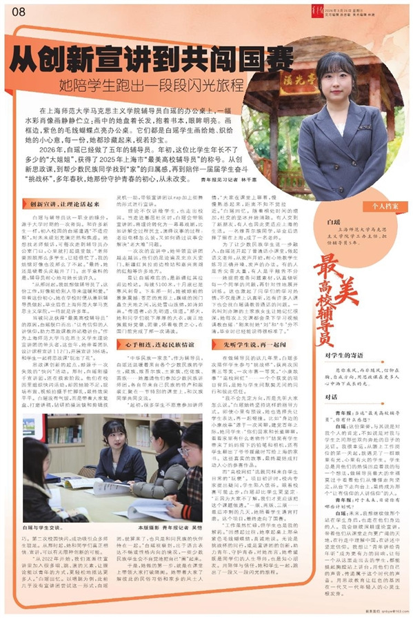 2026年,白瑶已经做了五年的辅导员。年初,这位比学生年长不了多少的“大姐姐”,获得了2025年上海市“最美高校辅导员”的称号。从创新思政课,到帮少数民族同学找到“家”的归属感,再到陪伴一届届学生奋斗“挑战杯”,多年春秋,她那份守护青春的初心,从未改变。 青年报见习记者 林千惠