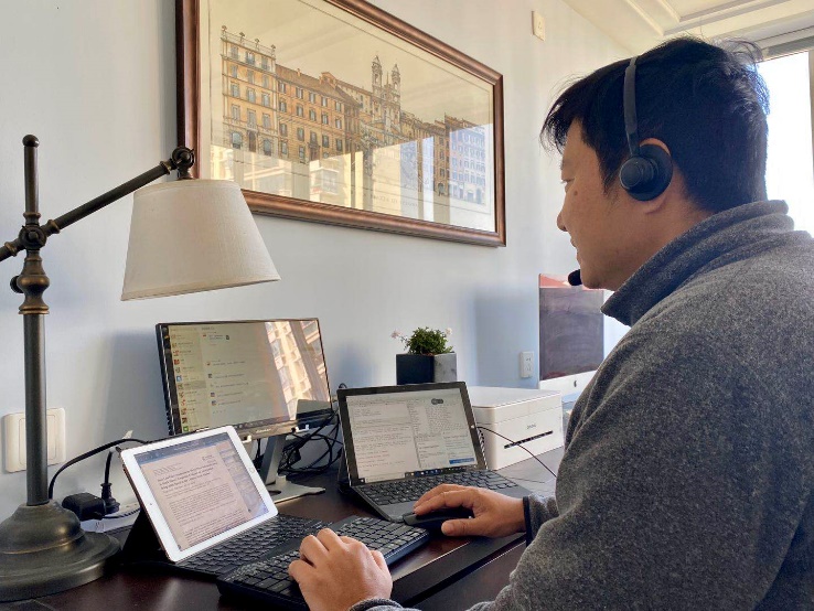 远程指导学生论文,商学院老师也是奇招迭出。戴上网上订购的话务耳机,搬出家中的多个电脑,搭建一个“老师STYLE”的直播间。通过VNC运程界面控制,帮助学生运程调试代码;打开文档协作程序,现场修改论文框架;微信群上文字要点总结、腾讯会议下小组语音指导,多种工具的组合使用使得师生之间的距离