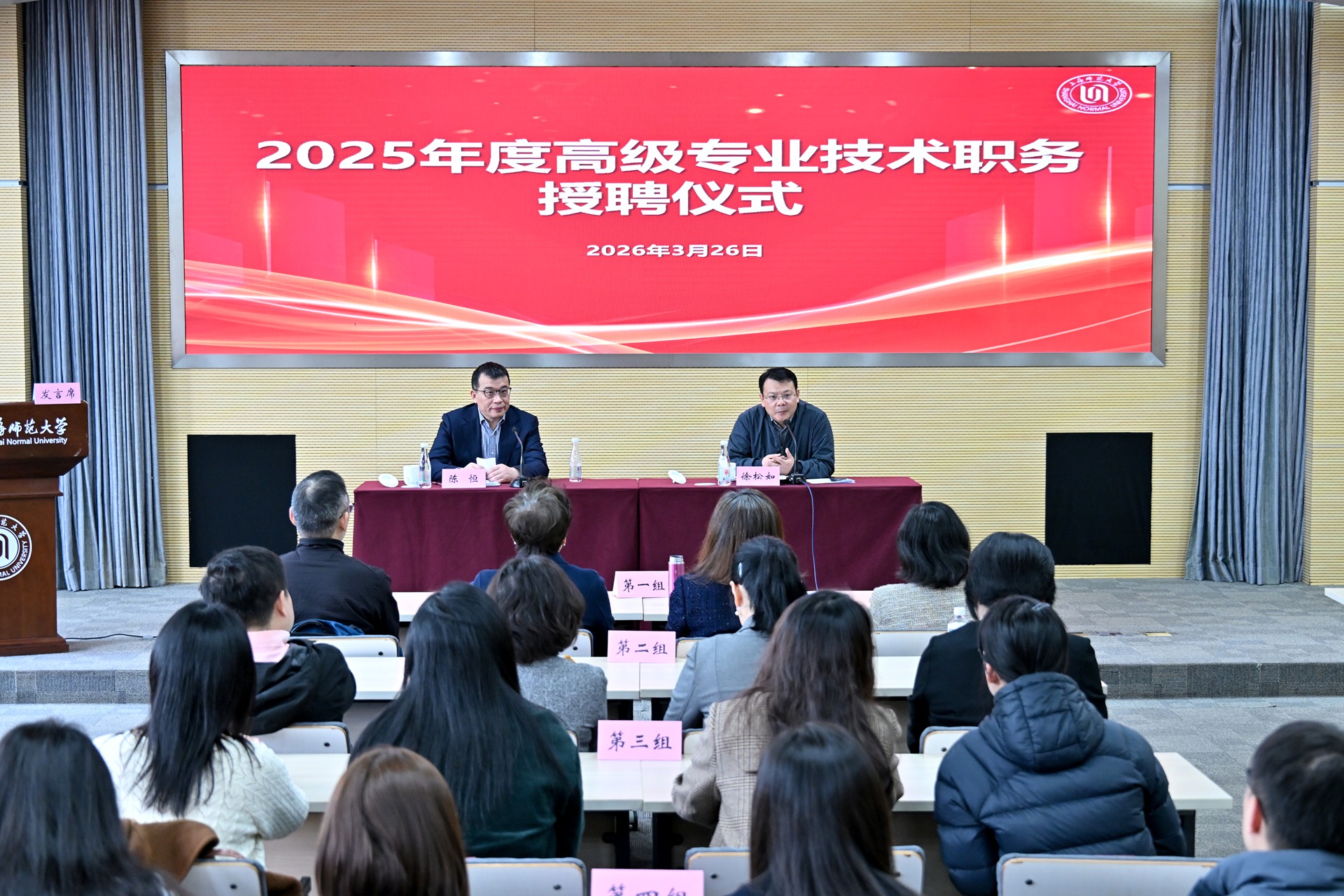 陈恒在发言中代表学校向本次受聘高级专业技术职务的各位老师表示热烈的祝贺,向大家长期以来的辛勤付出和为学校事业发展做出的积极贡献表示衷心的感谢。他指出,当前我们正处于“十五五”规划实施的开局之年,学校正深入推进以人才培养为导向的综合改革,努力打造一支师德高尚、业务精湛、结构合理、充满活力的高水平师资队伍是学校高质量发展的关键所在。陈恒强调,在高等教育综合改革的时代背景下,在学校建设教师教育领先的创新型高水平大学的目标指引下,受聘高级专业技术职务,是大家承担更大责任的新起点。他向受聘老师们提出了三点希望:一是躬耕三尺讲台,在立德树人的崇高使命上言传身教、春风化雨;二是深耕学术沃土,在攀登科学高峰的征途上追求卓越、引领前沿;三是胸怀发展大局,在服务国家战略的时代洪流中勇担重任、彰显价值。