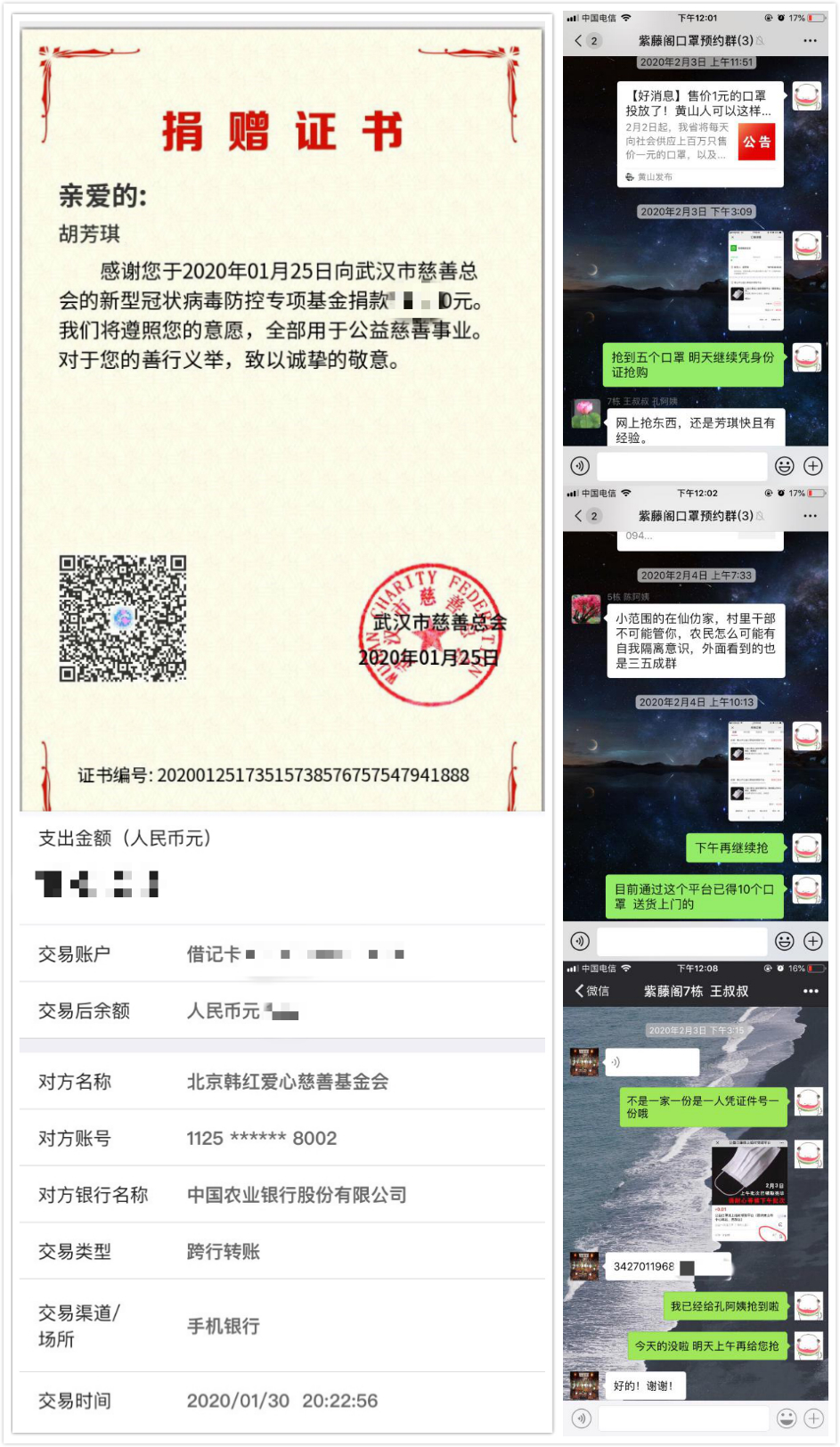 支部中刚刚入党的薛诗雯同学主动报名了家乡社区志愿者,每天对居民楼道、健身路径、信报箱、垃圾收集点等公共区域喷洒消毒液进行消杀,在社区主要路口、居民楼张贴公告、开展巡逻,排查社区情况。支部党员胡芳琪同学先后两次向武汉慈善总会和北京韩红爱心慈善基金会捐款,在发现小区有老人不会使用公众号平台预约口罩后,她又做起了“讲解员”,主动在微信群里演示操作方法,帮助老人预约口罩等。
