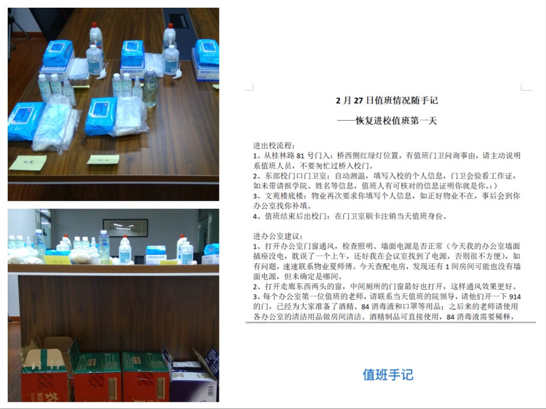在学校发布逐步恢复进校值班的通知时,保证值班人员基本防护安全措施的问题成为当下最紧急的事情。值班第一天,学院行政副院长为值班人员准备好防护用品,并认真撰写值班手记,供后续值班人员充分了解学校情况。支部党员肖文鑫、张丽等老师主动拿出家中备用的口罩、酒精、消毒液等,为值班教师的安全保障贡献一份力量。