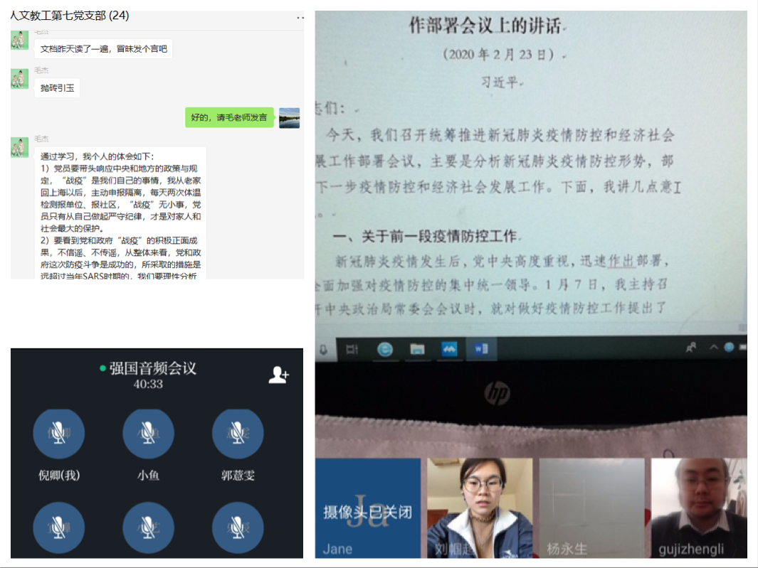 学院各教工党支部围绕疫情期间工作以及线上教学情况进行讨论,教师们积极用特有的方式和一如既往的育人情怀助攻防疫战,大家纷纷表示,疫情无情,人有情。距离阻挡不了教师履职履责的步伐。