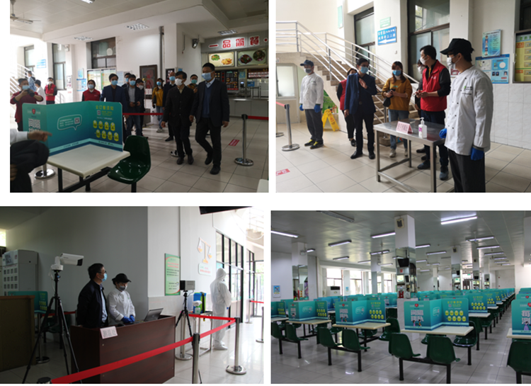 在香樟苑食堂,师生依次在食堂门口排队,戴好口罩、食堂外使用一米线围隔,在食堂门口进行体温监测,进入食堂后使用免洗洗手液洗手。在体温监测时发现有发热情况的学生,工作人员引导其到临时等候区,立即联系辅导员,辅导员赶到后交待注意事项并陪同学生去校医院复测体温。其他师生依次排队到达堂食窗口,打饭取菜、分开就坐就餐后按一米间隔排队交餐具至餐具回收点,工作人员引导学生从出口离开。此前,工作人员提前布置好食堂环境(包括布置一米线、餐桌隔板、测温台、临时等候区、洗手处等)、对环境进行彻底地清洁和消毒,备足食品原材料并准备好疫情期间营养套餐。