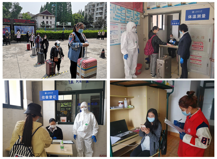在宿舍日常晨检时,志愿者在楼内逐间进行体温测量,学生每日上下午两次上传体温数据和健康状况等至微信“上海师大智慧校园公众号”。如发现体温异常,立即通知辅导员带离发热学生去校医院进行复查,同寝室同学迅速佩戴口罩,安排消毒人员及时消毒寝室,并对寝室其他人员进行检测,该寝室成员原地隔离14天,没接到正式通知前,不得出离寝室、其他无关人员禁止进入该寝室。