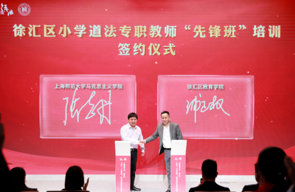 上师大马克思主义学院院长张志丹和徐汇教育学院院长浦正权联合签署了整体试验区“强师计划”重点项目,即制定小学道德与法治课程教师专职化培养方案,实施小学专职思政课教师“先锋班”共培,助力提升区域内小学思政课教师队伍的专业化水平。