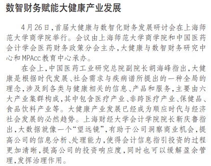 4月26日,首届大健康与数智化财务发展研讨会在上海师 范大学商学院举行。会议由上海师范大学商学院和中国医药 会计学会医药财务政策分会主办,大健康与数智财务研究中 心和MPAcc教育中心承办。 在会上,中国医药工业研究总院副院长胡海峰指出,大健 康是根据时代发展、社会需求与疾病谱所提出的一种全局的 理念,涉及到各类与健康相关的信息、产品和服务,主要由六 大产业集群构成,其中包含医疗产业、非跨医疗产业、保健品、 食品饮料产业等。大健康产业发展已经成为顺应时代与经济 社会发展的必然趋势。上海财经大学会计学院院长靳庆鲁指 出,大数据就像一个“望远镜”,有助于公司洞察商业机会,提 高公司的信息分析、处理能力,使得会计信息指引投资的过程 更加清晰,提高公司的投资响应度,同时也可以缓解盈余管理,发挥治理作用。