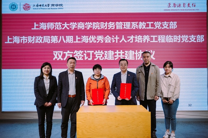 党课结束后,商学院财务管理系教工党支部书记刘红梅和上海市财政局优秀会计人才培养工程临时党支部书记吴浩作为双方代表,签订了党建共建协议。双方将深化产教融合,通过聘请会计行业领军人才担任会计专硕学生行业导师,相互推动、互相促进、相得益彰,深入贯彻科教兴国战略,为全面建设社会主义现代化国家提供有力人才支撑;发挥会计行业领军人才在大学生学业生涯规划、职业生涯规划、实习就业等方面的人生导师作用,通过专题讲座、沙龙交流、暑期职业训练营等形式,全面提升大学生的核心竞争力。