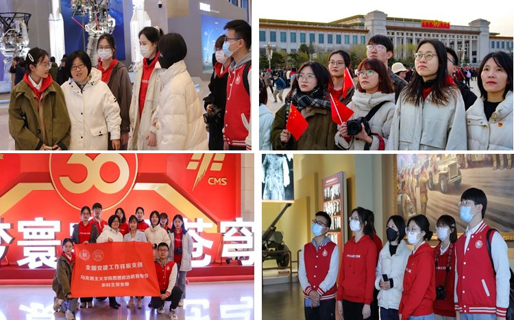 “实践课堂”第一站,马院师生首先来到首都北京,先后前往中国共产党早期北京革命活动纪念馆、香山革命纪念馆、国家博物馆、中国共产党历史展览馆等地,并在天安门广场观看了庄严神圣的升旗仪式。在香山革命根据地,师生们追寻着党的光辉历程,共同重温了那段烽火硝烟的红色记忆,感受共产党人忠贞无悔的信仰之路。在参观国家博物馆《复兴之路》展览馆时,马克思主义学院副院长贾淑品与同学们展开了一系列现场讨论,加深同学们对中国共产党领导全国各族人民实现中华民族伟大复兴这一历史进程的理解。在中国共产党历史展览馆,全国党建工作样板党支部——中国特色社会主义理论研究会党支部书记白瑶现场领学,带领同学们沉浸式感悟中国特色社会主义进入新时代,全面建成小康社会,开启全面建设社会主义现代化国家新征程的深刻历史变化。